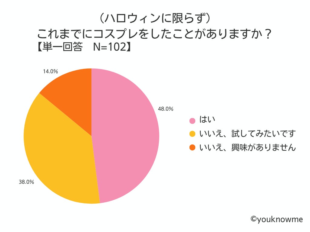 日本のハロウィンの魅力として注目が高いコスプレですが、コスプレ人気はハロウィンだけではありません。コスプレ経験について聞いてみたところ、48.0%の人が「経験がある」という結果となり、経験はないが試してみたい人も38.2%と、コスプレに対する高いモチベーションが見られます。