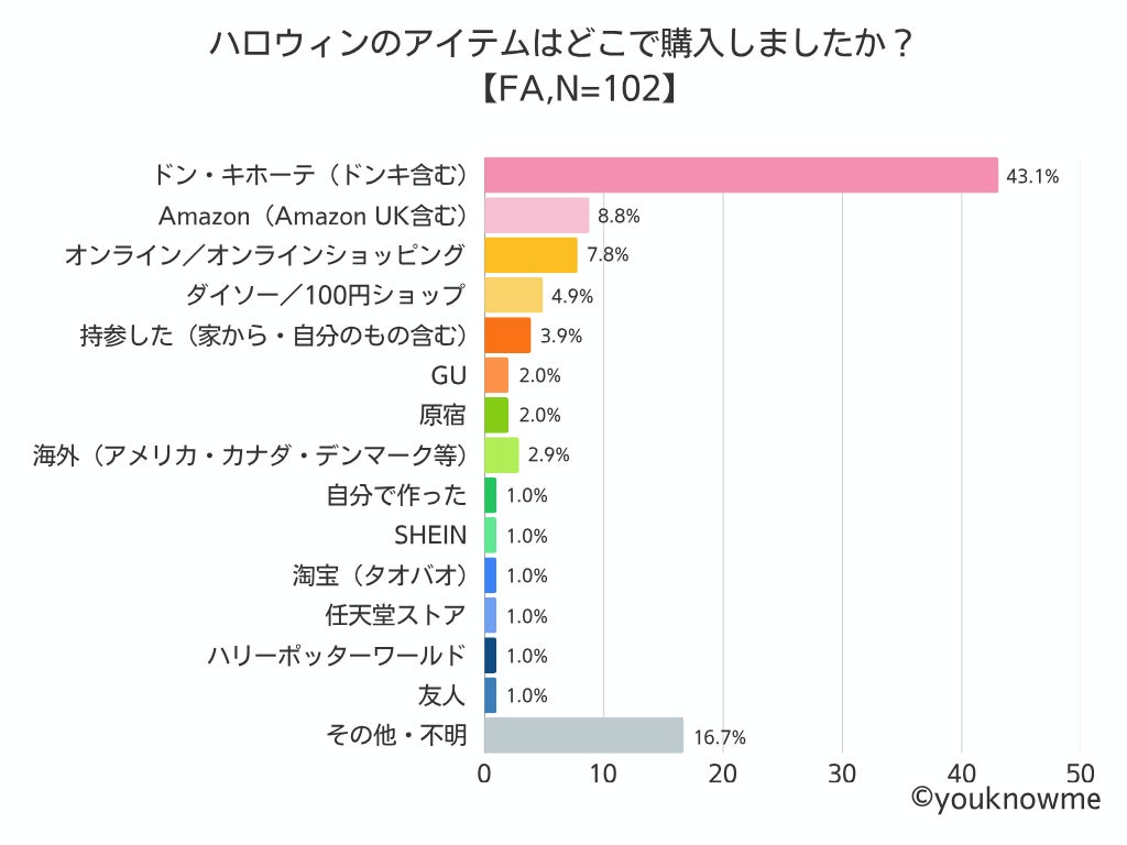 アイテムの購入場所を問う設問(フリーアンサー)では、1位がドン・キホーテ(43.1%)、その他ダイソーやGU等のショップ関連の声もありました。日本旅行中にもアイテムを現地調達するなど、ハロウィンへの熱量が感じられます。