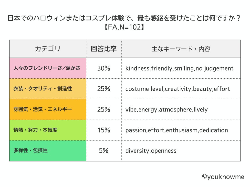 そして、日本でのハロウィンまたはコスプレ体験で最も感銘を受けたことを問う設問(フリーアンサー)では、「人々がとても親切」、「みんながフレンドリー」など“人”そのものへの感銘の声が多数挙がるとともに、単なるイベントではなく、オープンで受け入れ合う空気感に対する感動の声が多く寄せられました。