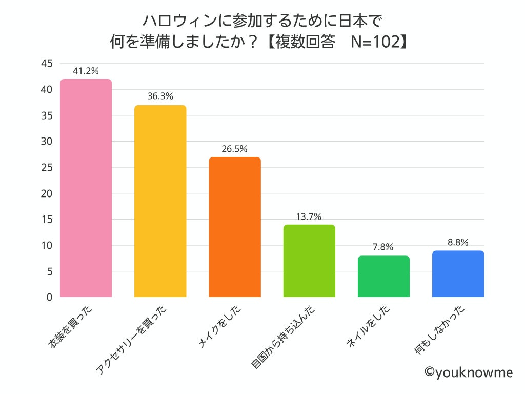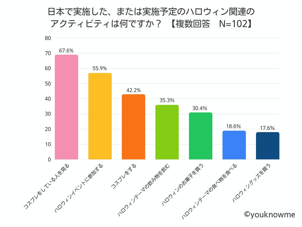 日本で実施した/実施予定のハロウィン関連のアクティビティについて聞いてみたところ、コスプレしている人を見る(67.6%)、ハロウィンイベントに参加する(55.9%)、コスプレをする(42.2%)というコスプレに関する体験が上位となりました。日本でのハロウィン準備に関する設問においても、実際に日本滞在中に新たな衣装(アクセサリー含む)の購入やメイクを楽しむといった回答が目立ち、コスプレを楽しむための準備をしていることが分かります。