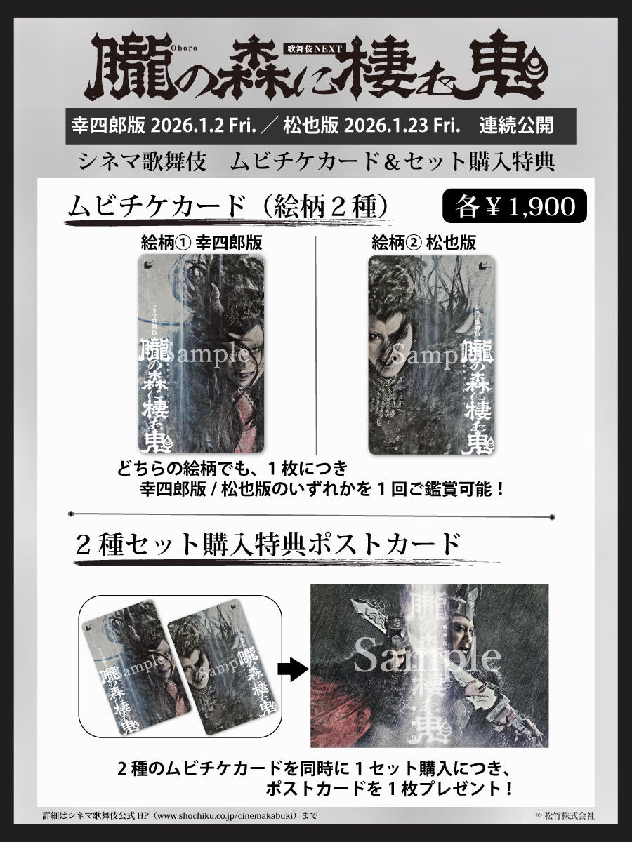 ※セット購入特典のポストカードは、ムビチケカードの絵柄2種を同一会計でお求めいただいた場合のみ、1セットにつき1枚お渡しします。別会計で購入された場合や、幸四郎絵柄のみ2枚、または松也絵柄のみ2枚ご購入の場合は特典が付きません。