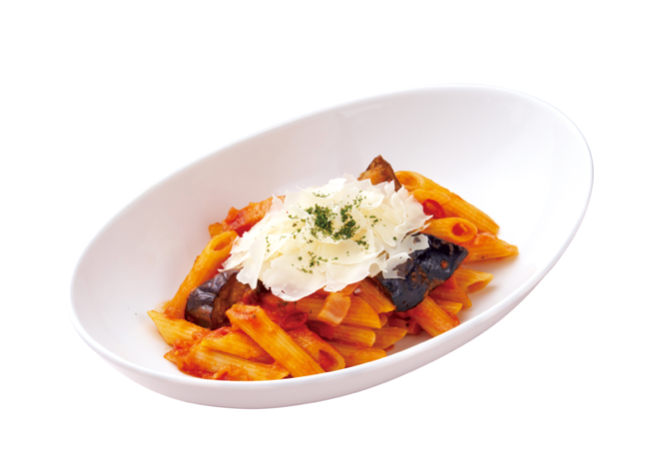 乱切りのなすとベーコン、そして薄削りのパルメザンチーズをトッピングし、麺はソースの絡みがよい生パスタのペンネを使用しています。時間が経ってもくっつかず美味しさそのままです。