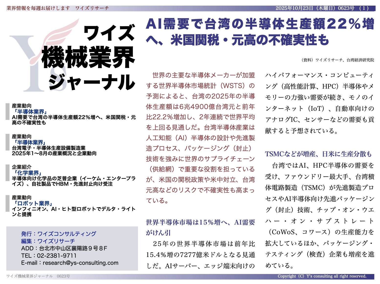 【台湾情報】AI需要で台湾の半導体生産額22%増──TSMC、日米での生産分散進む<ワイズ機械業界ジャーナル2025年10月第4週号発行>