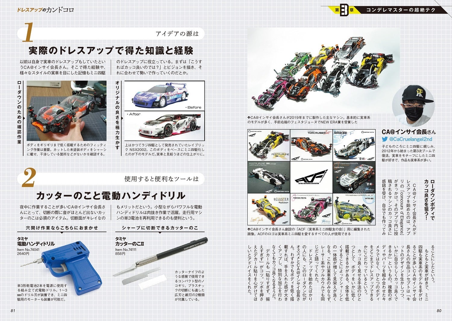 最新刊となる本書では、マシンの美しさを競う「コンデレ(コンクールデレガンス)」で入賞するためのドレスアップ術を公開。基本の「き」から高度な工作までを網羅し、コンデレレーサーたちのミニ四駆ライフをサポートします。