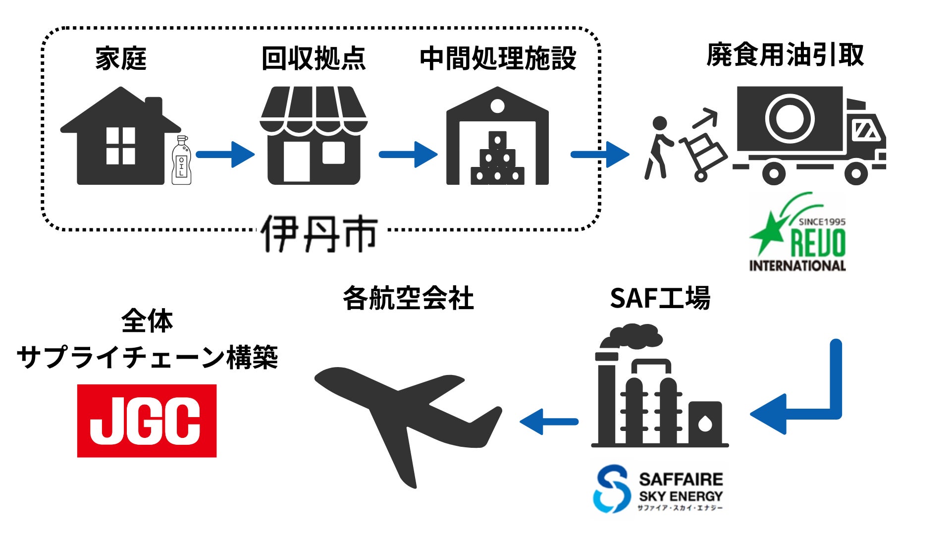 伊丹市内の市庁舎や市立体育館をはじめとする公共施設11箇所で伊丹市が回収した廃食用油をレボインターナショナルが収集し、国内初のSAF大規模生産を行うSAFFAIRE SKY ENERGYのプラント(コスモ石油堺製油所内、2024年12月完工)へ運び、国産SAFの原料として資源化します。