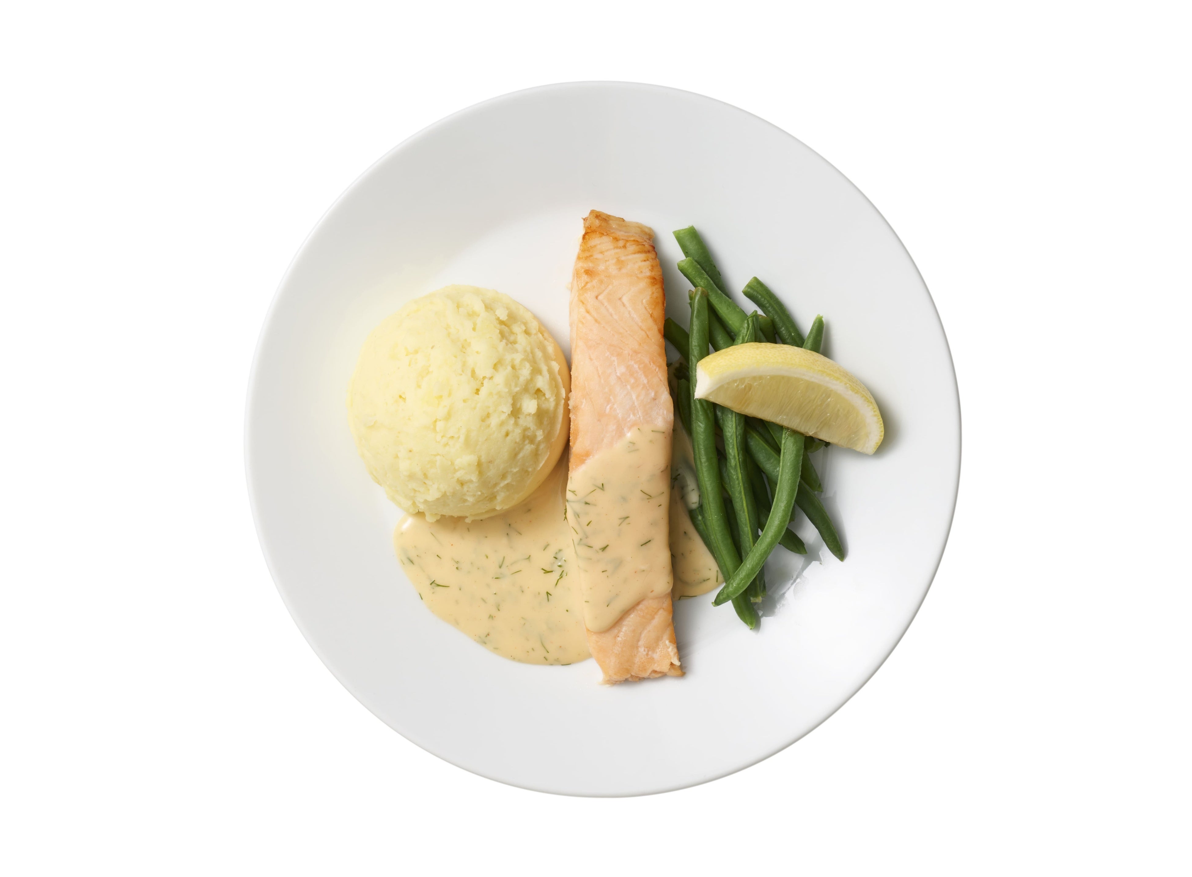 レモンディルソースの香りが引き立つ上質なサーモンフィレ。クリーミーなマッシュポテトといんげんを添えました。爽やかで贅沢な一品をお楽しみください。