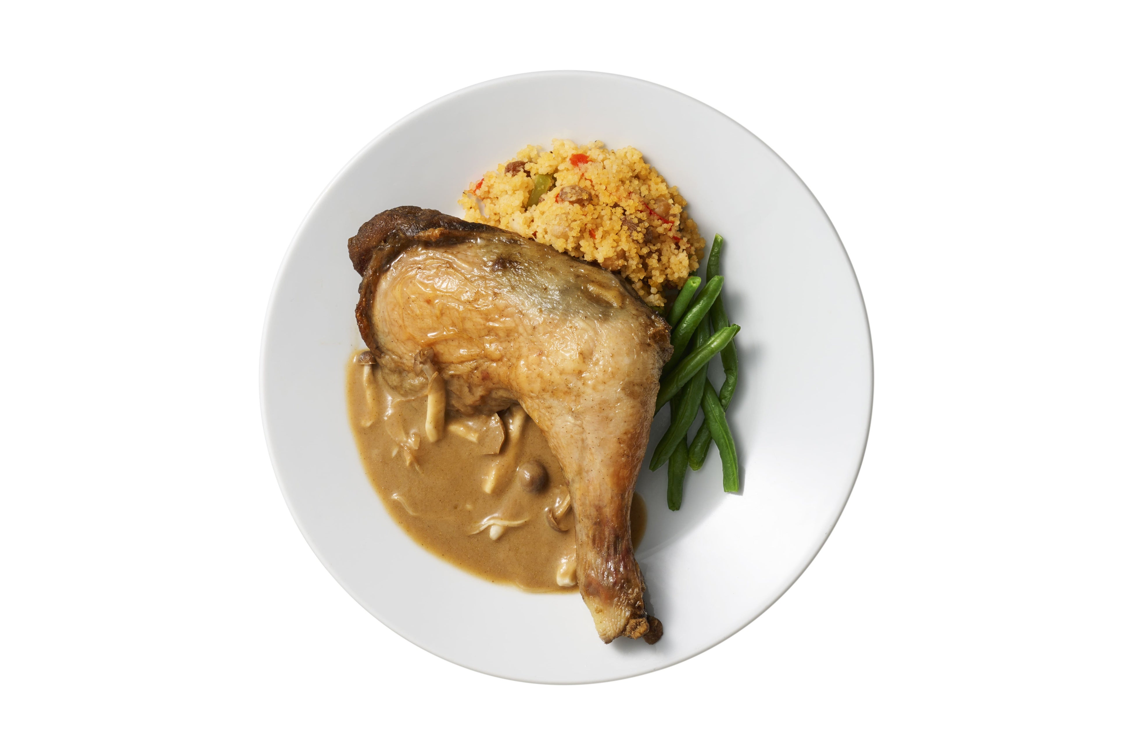 濃厚なきのこソースをたっぷり乗せた食べ応えのあるチキンコンフィ。色とりどりの具材、クスクスと一緒に召し上がれ。
