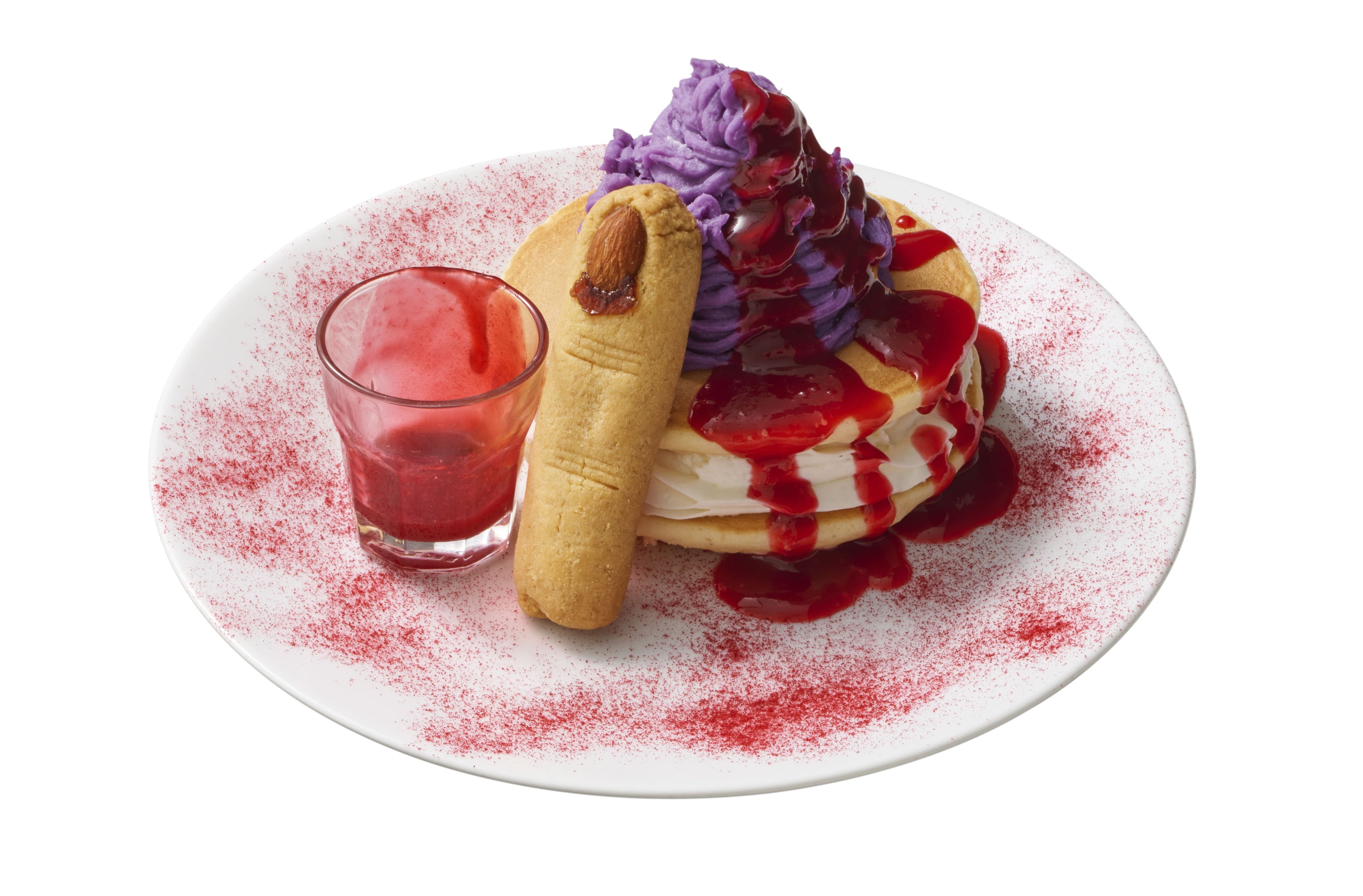 紫芋モンブランに指型のクッキーを添えられた、ちょっぴり怖い一品。ラズベリーソースをかけるとさらに不気味。パンケーキの中は、りんごの爽やかさがアクセントになり、不気味な見た目とフルーティーな味をお楽しみください。