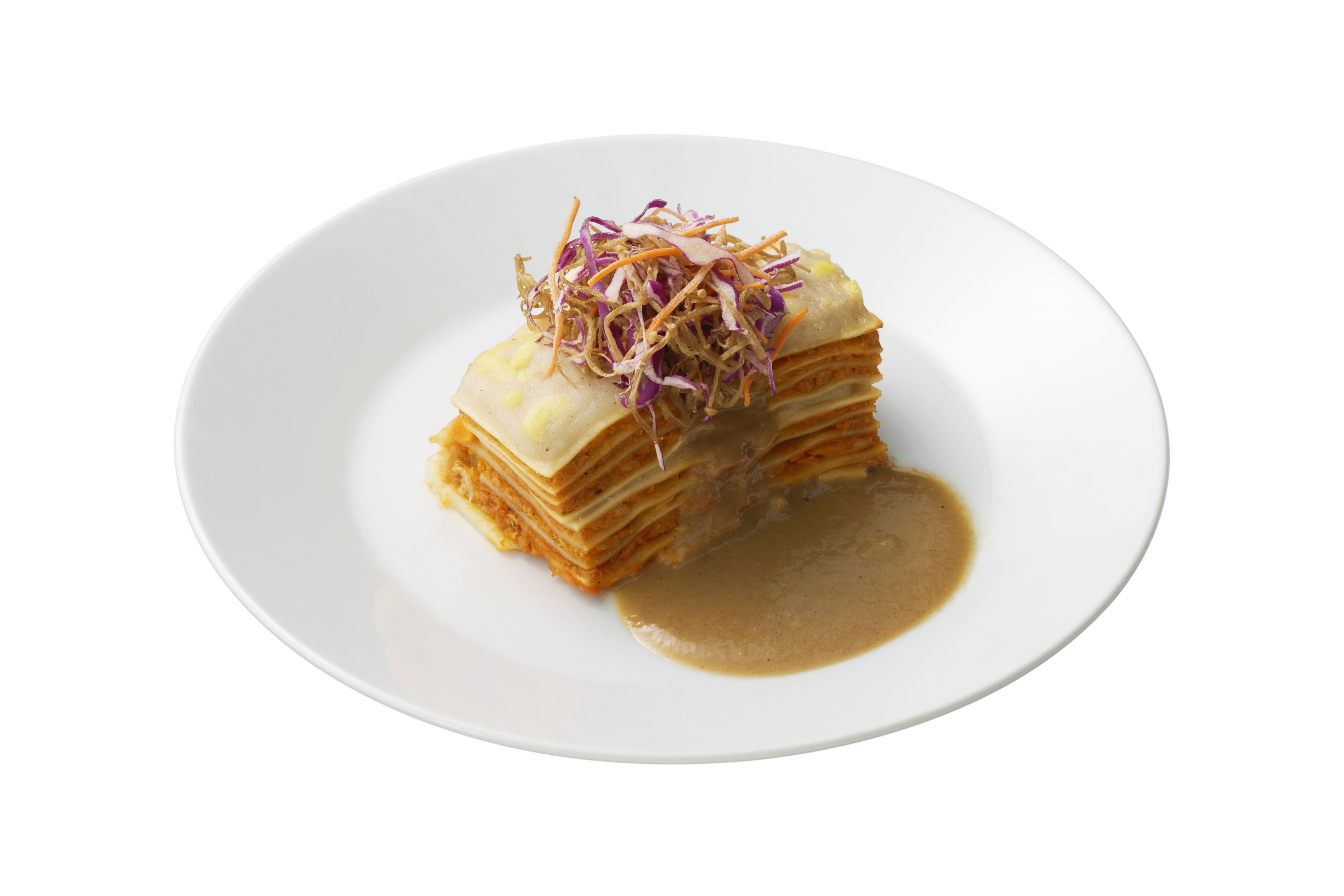 植物由来のラザニアに濃厚なきのこソースを添え、食感のアクセントに紫キャベツをトッピングしました。ヘルシーで秋を感じる一品です。