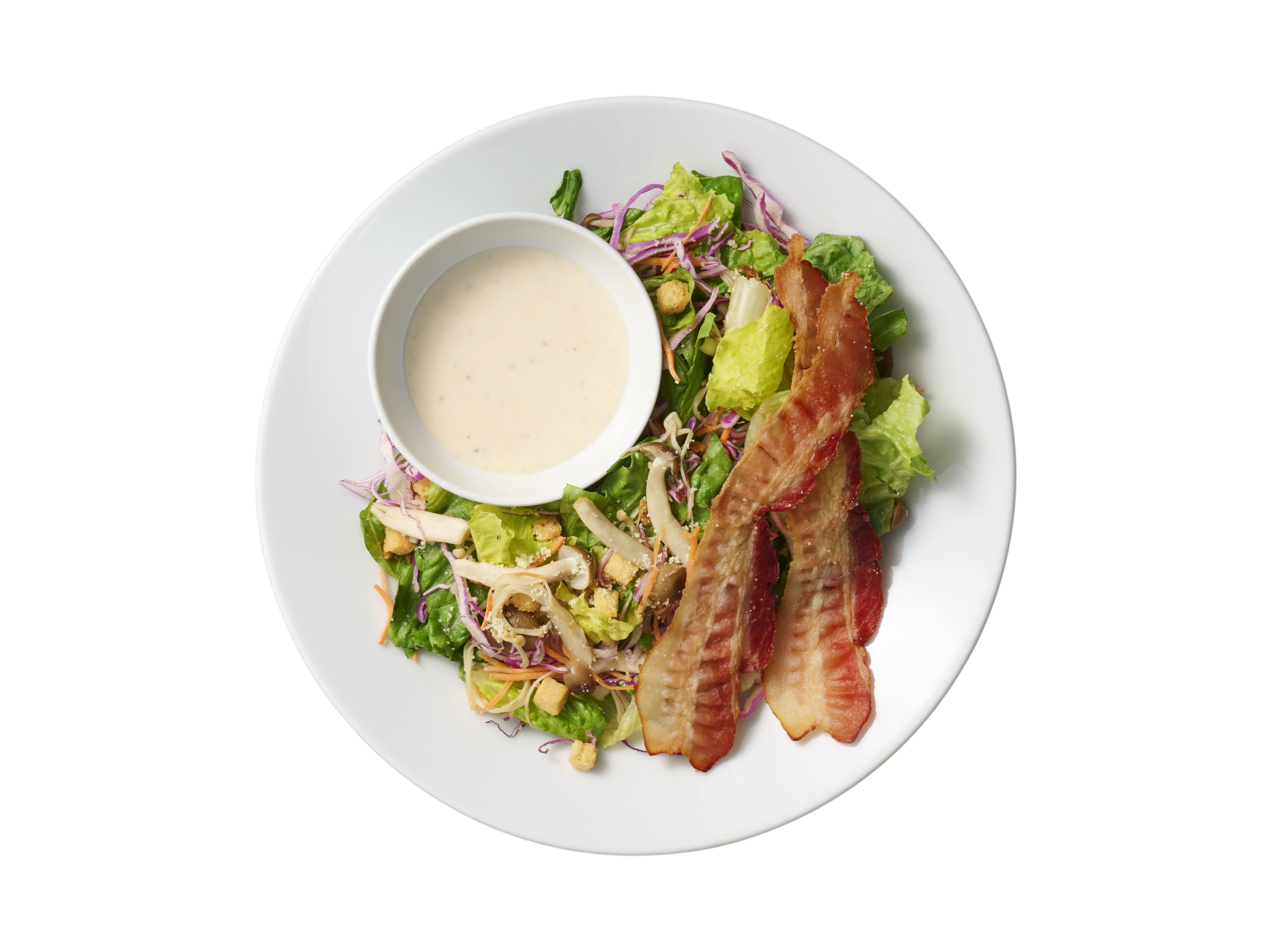 新鮮なロメインレタスに、季節のきのこをトッピング。カリカリベーコンとシーザードレッシングで贅沢なサラダをお楽しみください。