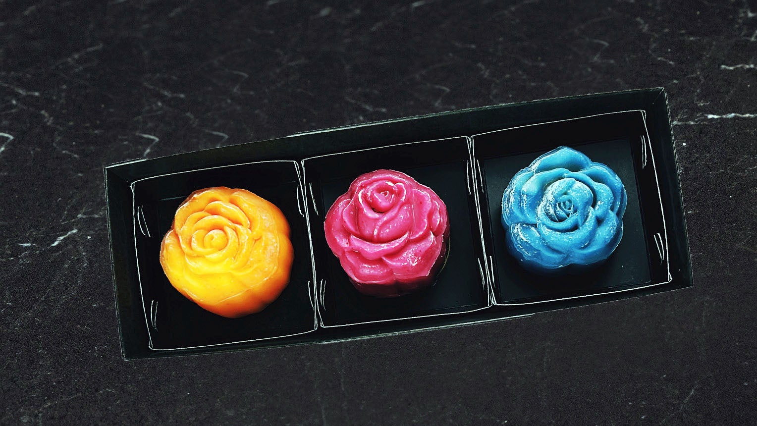 薔薇の花びらを練り込んだ淡いピンクのあんで、柔らかな求肥を包み込んだ、華やかな薔薇の香りを楽しむ、贅沢な味わいのムーンケーキです。