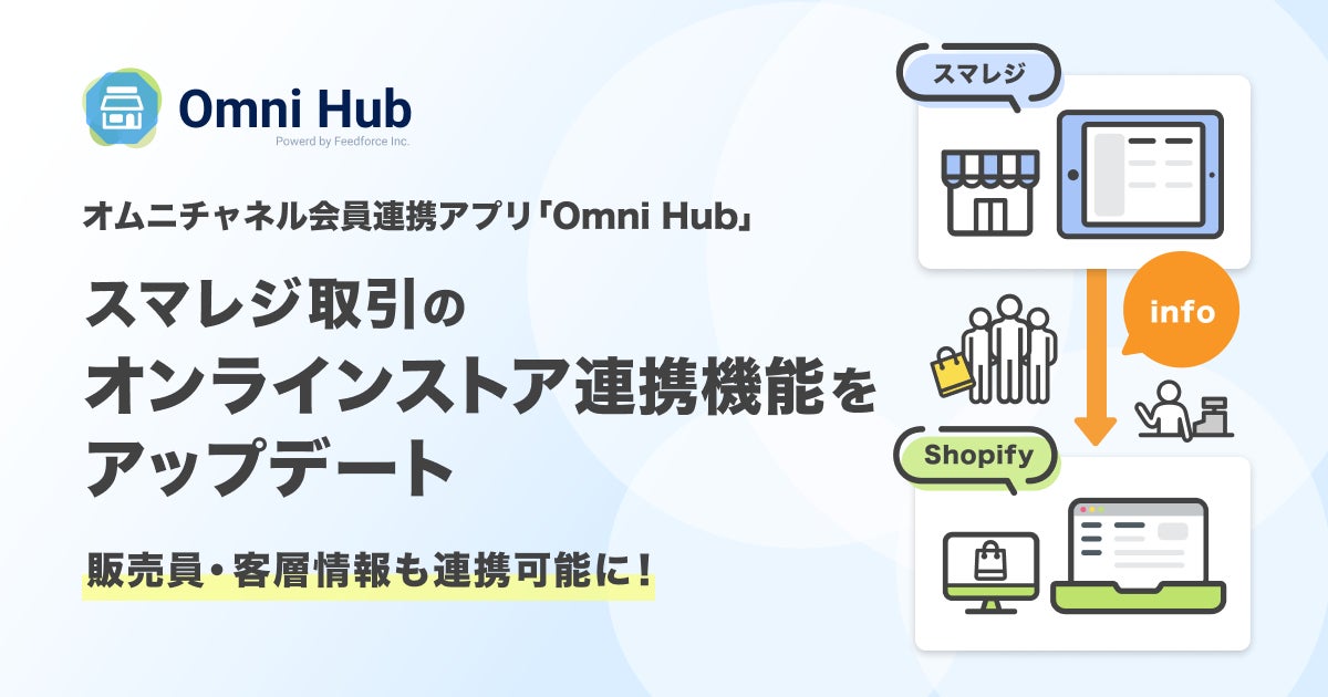 オムニチャネル会員連携アプリ「Omni Hub」(株式会社フィードフォース、所在地:東京都港区、代表取締役:塚田 耕司)は、スマレジPOS上で作成された店舗の購買情報をオンラインストア上に連携する「スマレジ取引連携機能」をアップデートし、店舗購買に紐づく「販売員情報」や「客層情報」も連携できるようにいたしました。