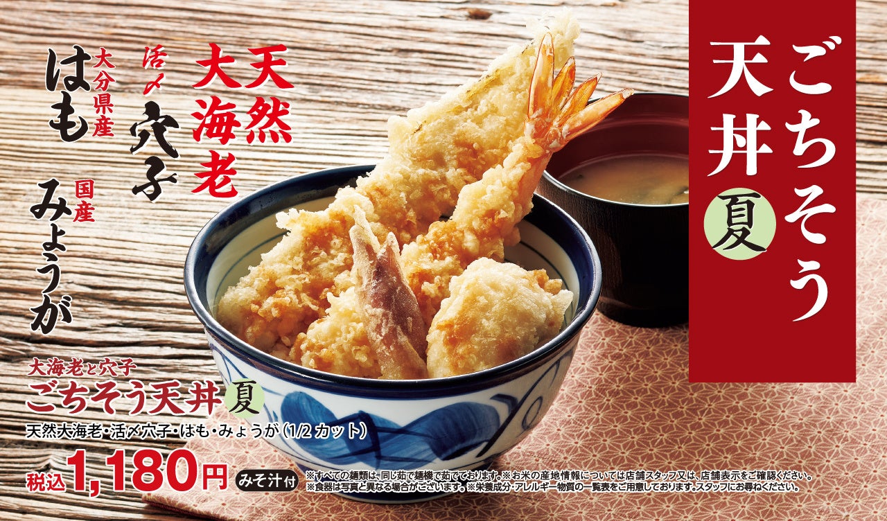 そのほか、第1弾から好評の『夏野菜の天丼』や、『ごちそう天丼(夏)』、そば(またはうどん)がセットになったメニューも販売いたします。是非この機会に「天丼てんや」の夏季限定メニューをお楽しみください。