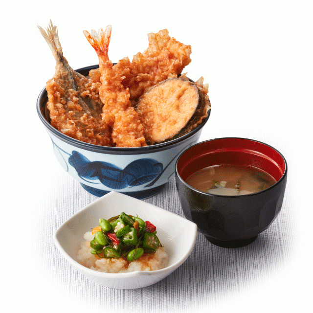 肉厚でふっくらとした鳥取県境港(さかいみなと)水揚げ「あじ」、定番の「海老」、食べ応えのある「大いか」、みずみずしい「米なす」をてんや自慢の甘辛たれにまるごとくぐらせています。たれが染みた天ぷらは、暑い夏ならではの濃い味です。さらに別売りの「とろろ」も相性抜群、すっきりとした後味でのど越しよくお召し上がりいただけます。