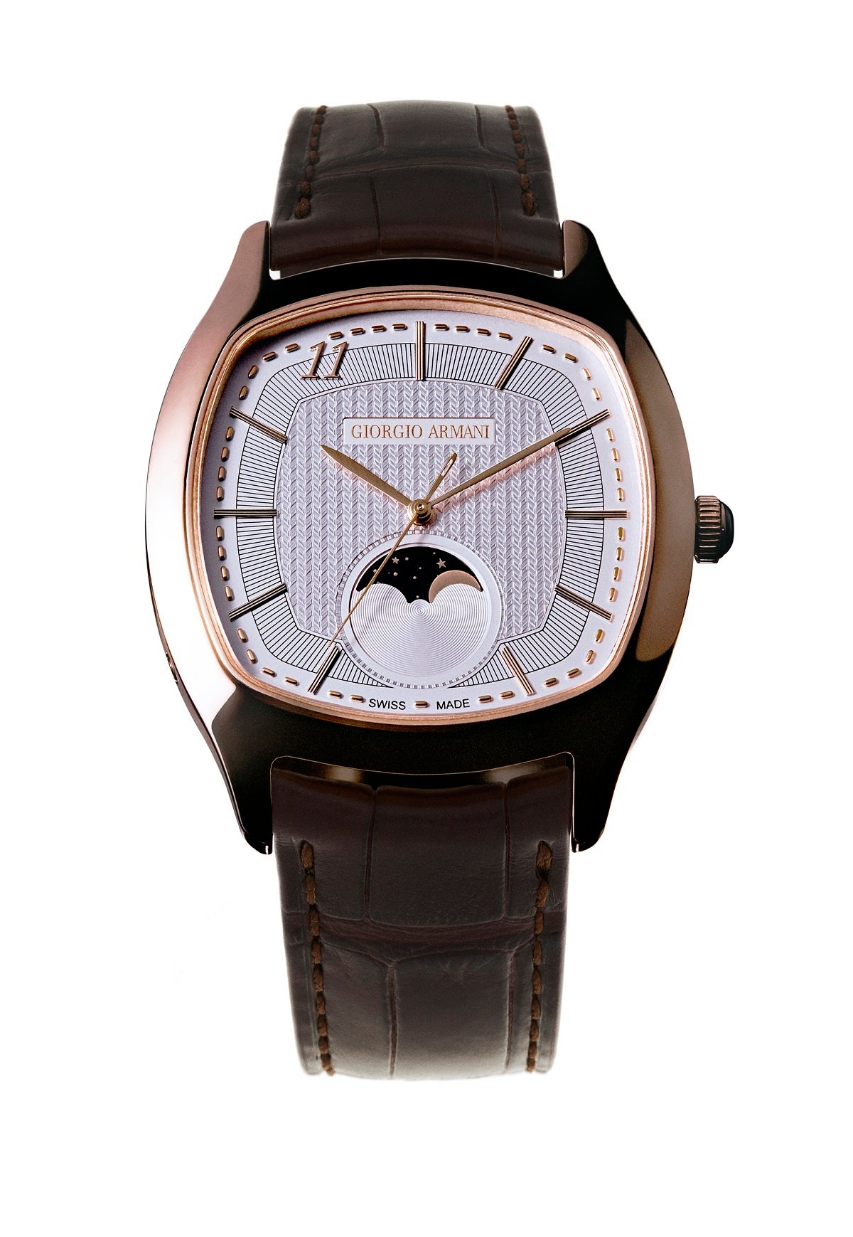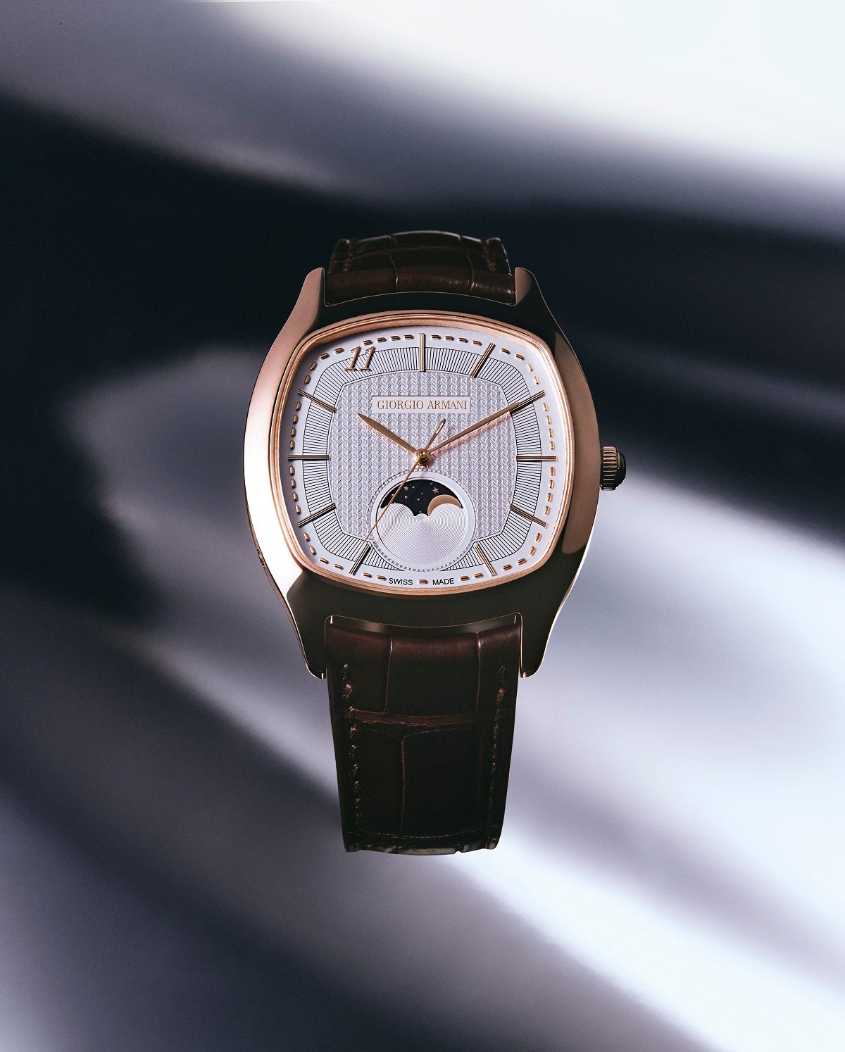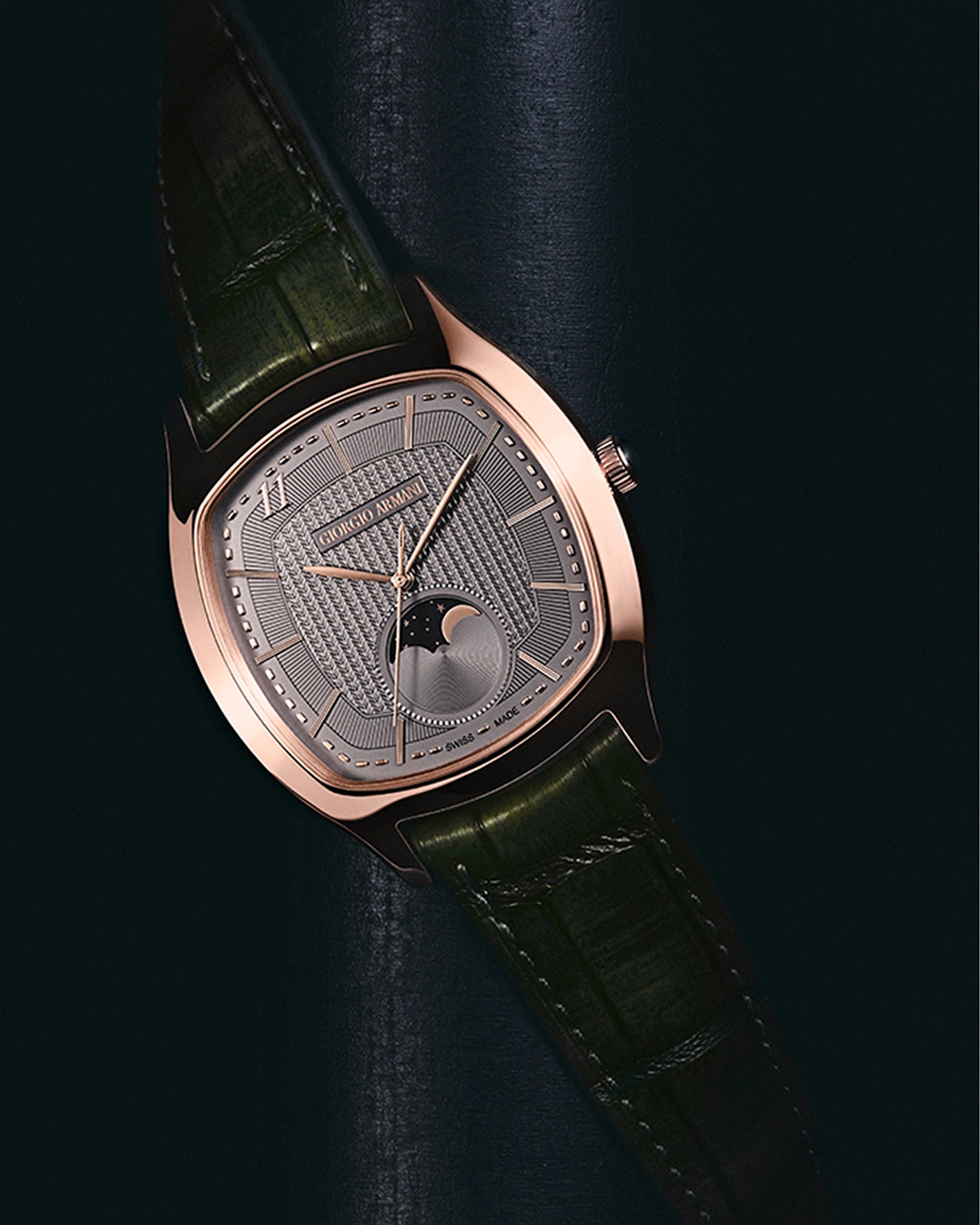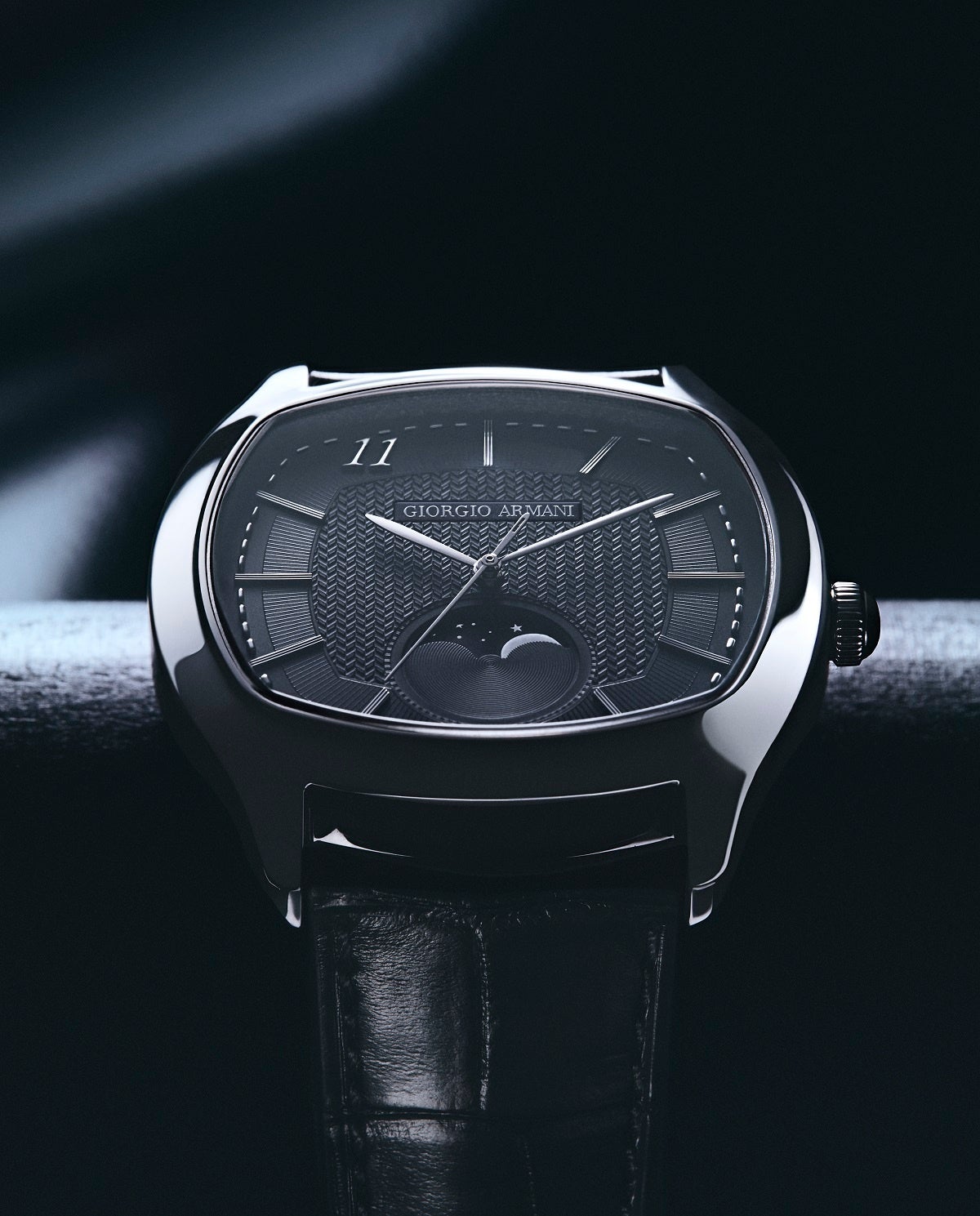 こちらのモデルは、ムーンフェイズ、自動巻きムーブメント、丸みを帯びたスクエア型のダイアルを備えた、シックな雰囲気の腕時計です。ジャケットのインナーにあるジョルジオ アルマーニのラベルを想起させるステッチモチーフ、12時位置のブランドロゴ、針とハサミのように細くエレガントな針など、男性らしさと女性らしさが融合したファッションブランドらしいテーラリングのディテールが特徴的です。文字盤上の時間はインデックスのみで表示され、11だけは時計のネーミングにちなんでアラビア数字で表記されています。様々な要素がハーモニーを奏で、確固たる調和美を生み出している文字盤に仕上がっています。