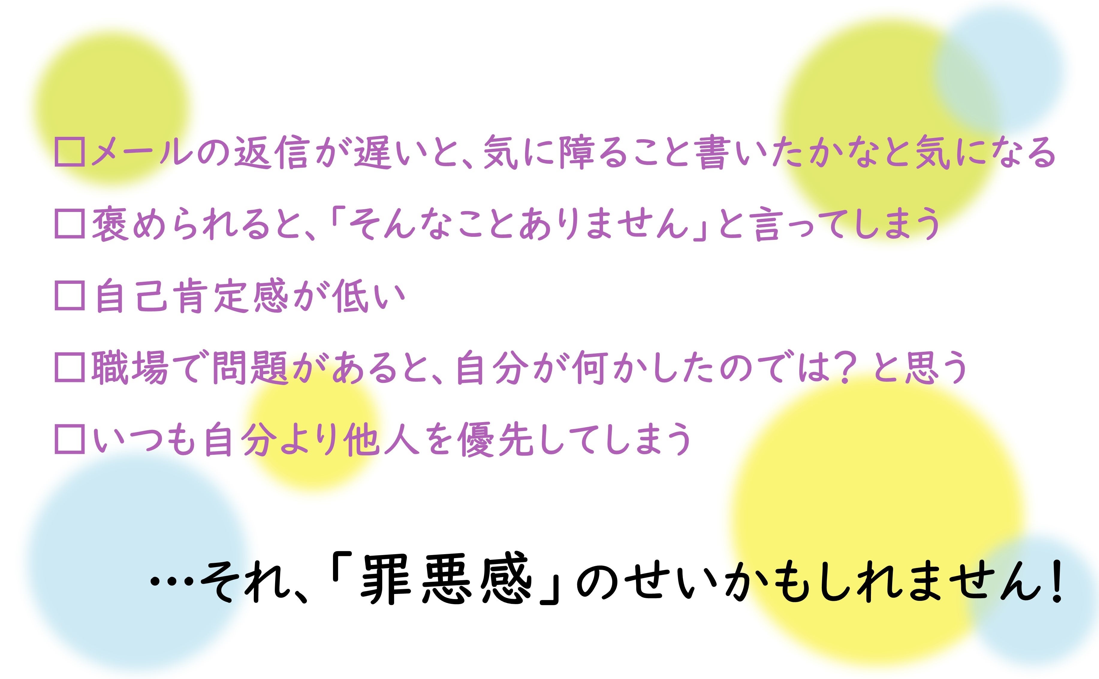 「褒められると居心地が悪くなる」「つい「すみません」と言ってしまう」「楽しいことをしていると申し訳ない気持ちになる」「他人の失敗も自分が悪いような気がしてくる」……