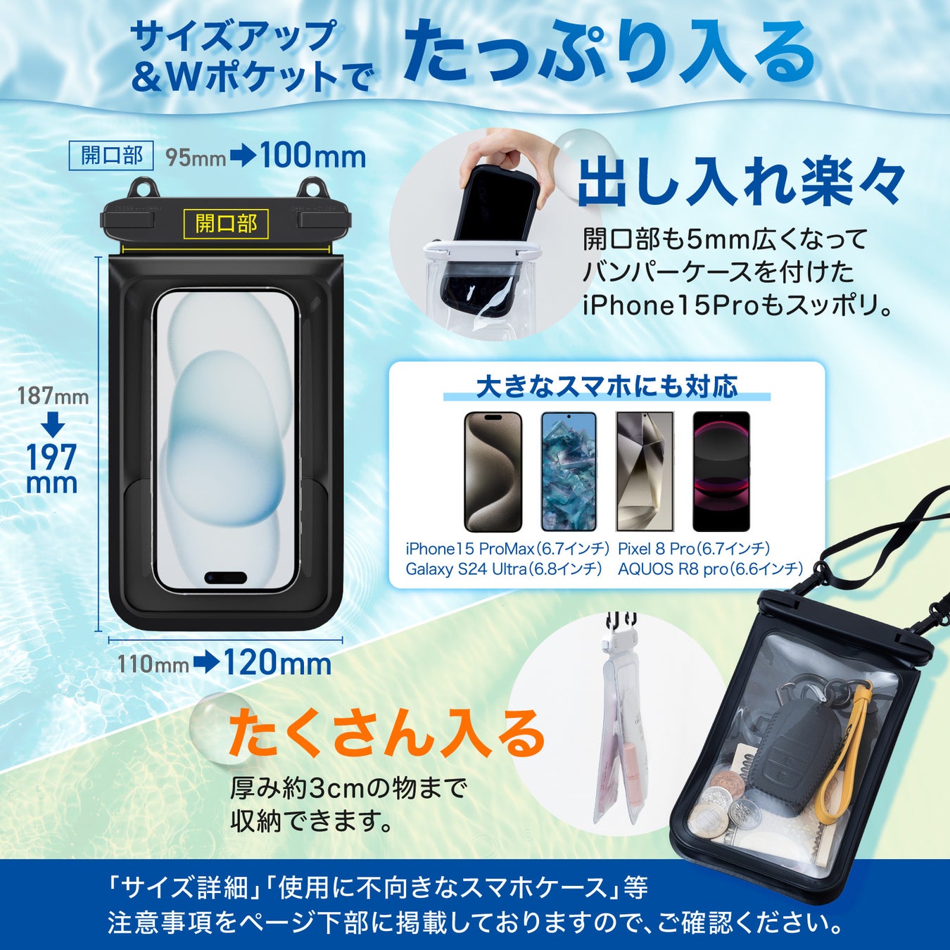 この防水ケースはスマホだけでなく、小銭や鍵、カードなどの小物も収納できるダブルポケットを備えています。厚み約3cmの物まで収納可能で、従来品と比べてサイズもアップし、6.8インチまでのスマホに対応しています。