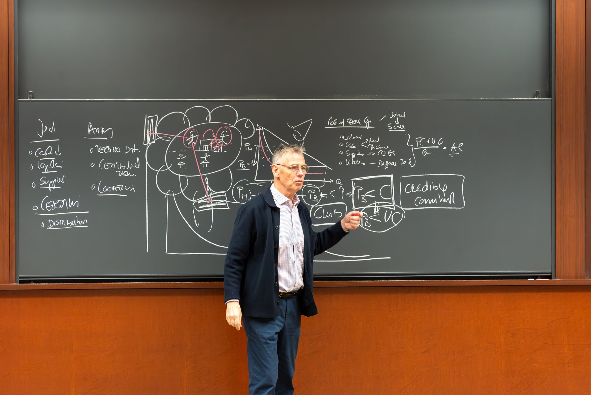 11月3日(火)から7日(金)にかけて、名古屋商科大学の客員教授であり、世界トップクラスのビジネススクールIMD(スイス)の経済学・経営政策の名誉教授であるRalf Boscheck氏による集中授業を開講しました。Ralf Boscheck教授は、戦略、経済、政策を専門分野とし、30年にわたる研究では、企業の競争優位性の評価や、企業利益と社会価値の創出との重要なバランスに焦点を当てています。特に、企業が持続可能な取り組みを行いながら利益を上げることを妨げている規制上の課題を明らかにするプロジェクトに取り組んでおり、グローバルな視点でビジネスと社会の関係性を探求しています。
