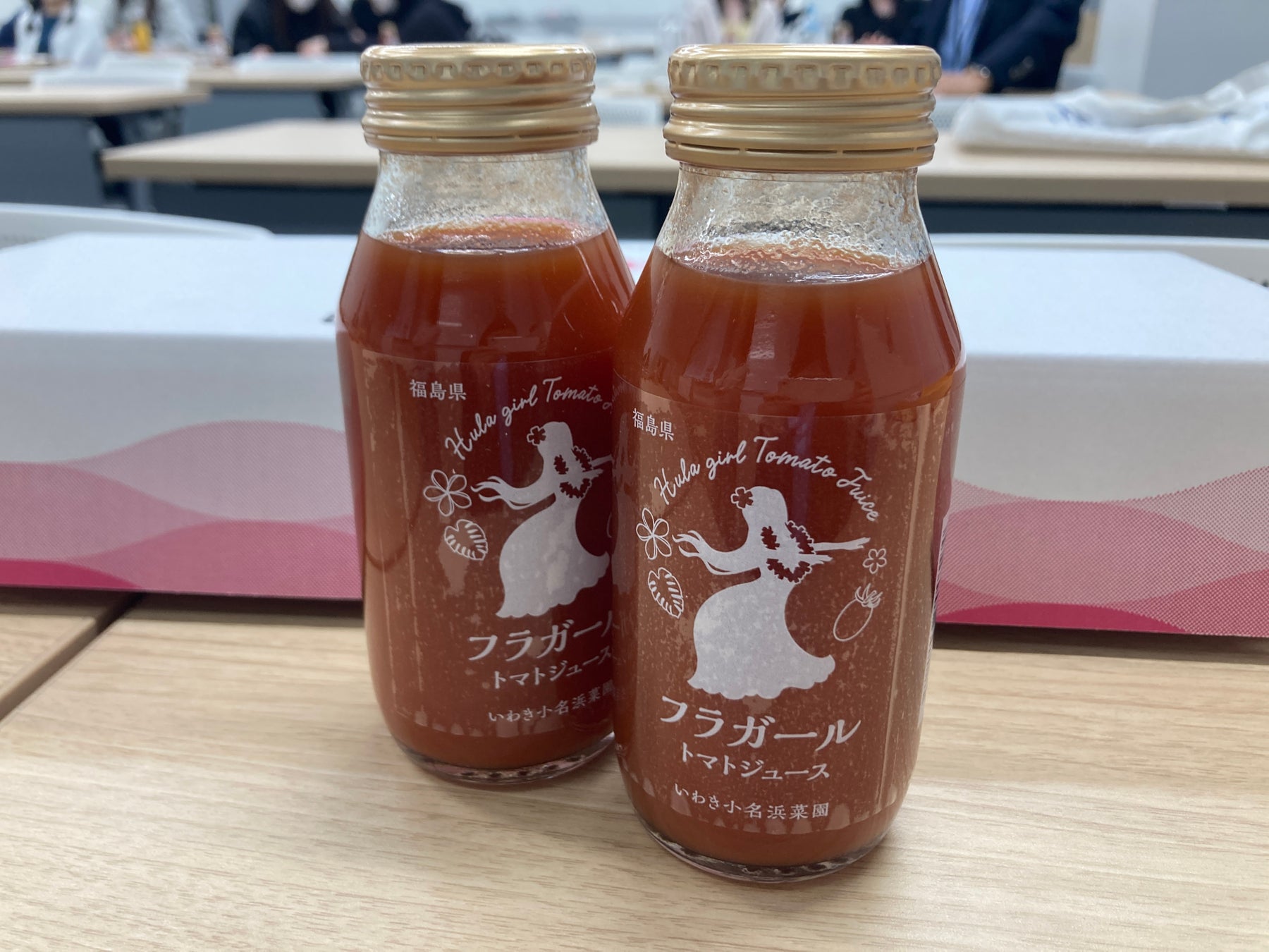 プロジェクト初日となる4月16日に行われたオリエンテーションでは、9名の学生が参加し、「いわき小名浜菜園」の担当者から、「フラガールトマトジュース」の概要と現在の課題等の話を聞き、5種類のトマトジュースを飲み比べて、商品の特徴や差別化のポイントを認識する実習を行いました。参加した学生は、「昨年からこのプロジェクトを開始し、規格外品のトマトの有効活用について考えてきた。4年生として、これまでやってきたことを実践で生かし、学びの集大成としたい」と、語っていました。今後、同大学の学生を対象にしたマーケティング調査等を行い、7月の最終発表に向け、4か月間にわたり学修します。産学連携による取り組みを通じて、人材の育成と、社会課題である「食品ロス削減」に向けての意識醸成を図ります。