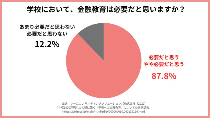 保護者からの金融教育を求める声も多く、ホームコンサルティングソリューションズ株式会社の調査では、約9割の保護者が学校での金融教育が必要だと回答しています。