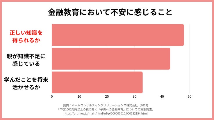 これまで金融教育を受けてこなかった親世代は、自分自身に金融知識不足を感じており、金融教育で正しい知識を得ることができるのか不安に思っています。