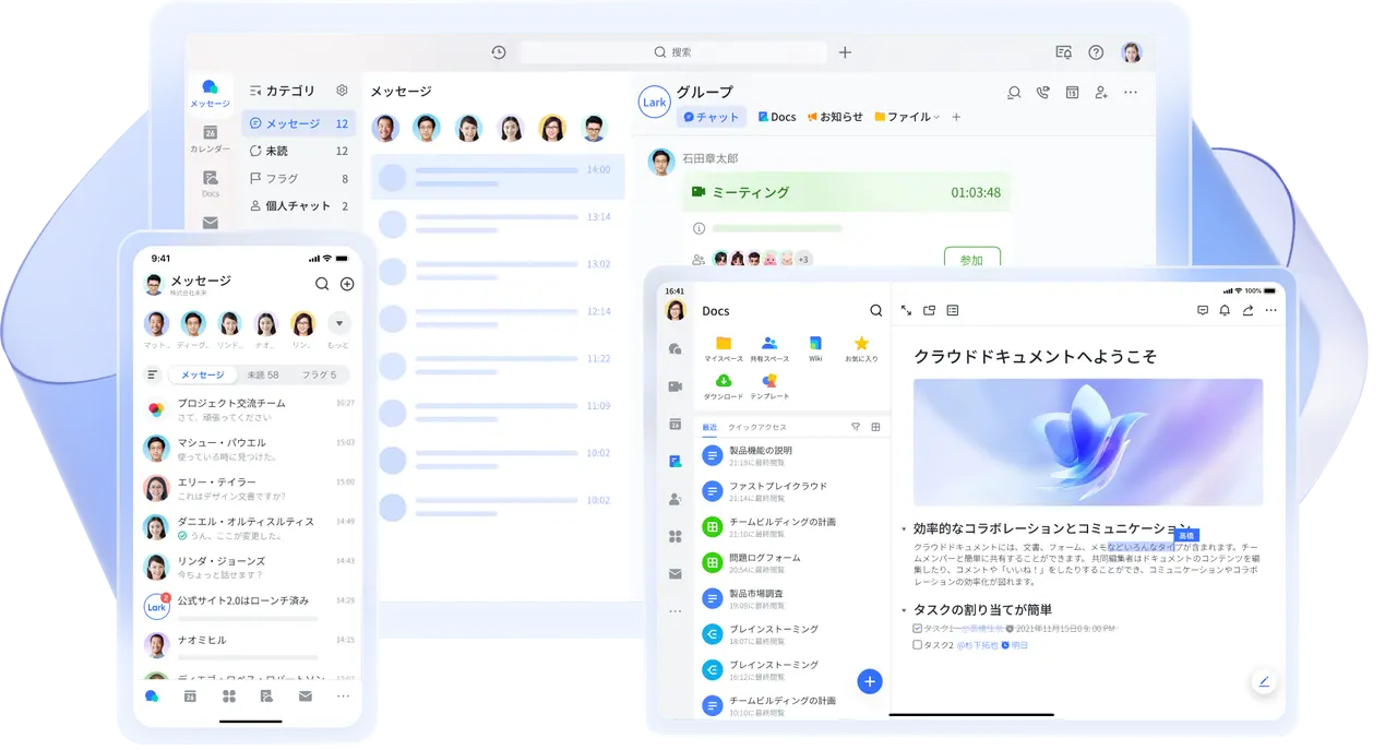 Larkは、あらゆるニーズに対応する1つのスイートで、チームの共同作業を可能にする次世代コラボレーションツールを特徴としています。チャットを起点に、メール・カレンダー・ビデオ会議・ドキュメント・ワークフロー・バックオフィス機能など、多数の頻用ツールを1つのプラットフォームに統合することで、より効果的なコラボレーションが実現できます。すべての機能が1つのアプリに統合されており、Mac、Windows、iOS、Androidで利用可能です。