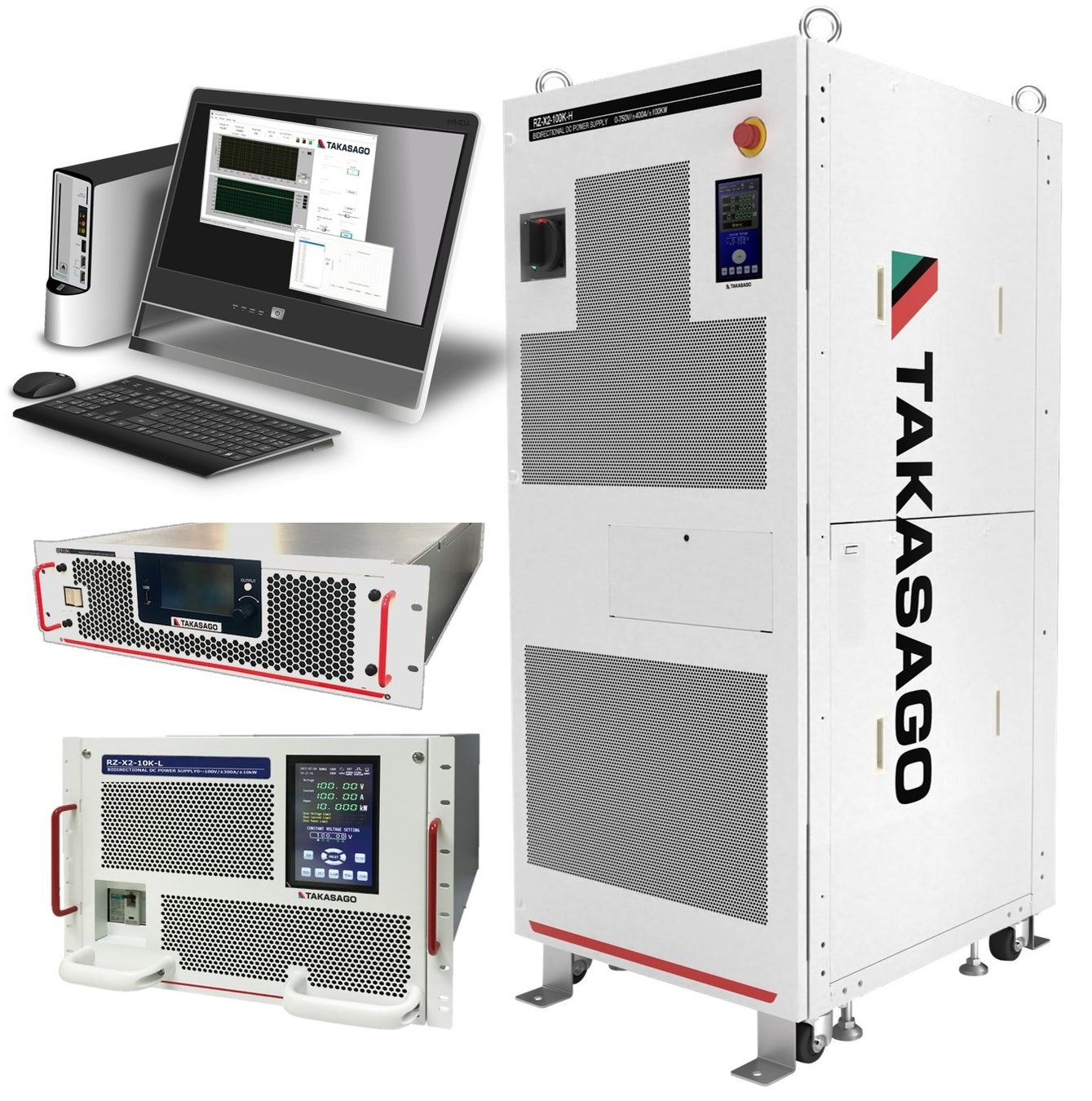実車に近いテスト環境を再現し、EVパワートレインの試作評価から量産検証までを支援する双方向直流電源「RZ-X2/RZ-XA」と、バッテリ/モータ模擬や充放電試験に対応したソフトウェア「LinkAnyArtsシリーズ」。