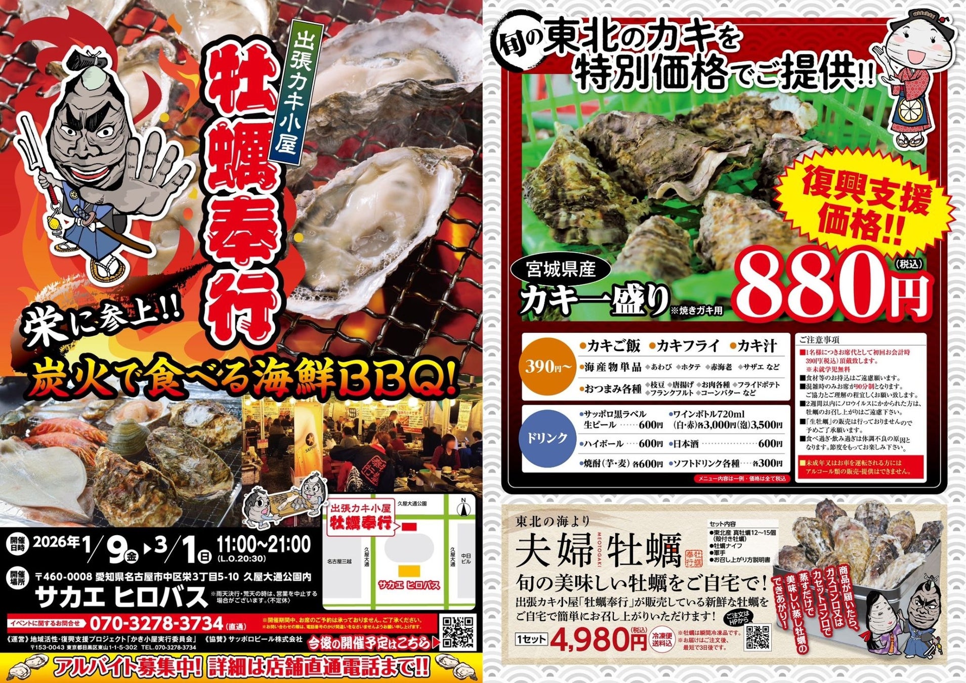 愛知県名古屋市に「出張カキ小屋」好評開催中!サカエ ヒロバス 久屋大通公園内《 宮城県産殻付き牡蠣が一盛り880円!! 》