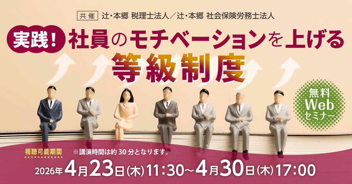 辻・本郷 税理士法人(本社:東京都新宿区、理事長:桑木小恵子)は、辻・本郷 社会保険労務士法人(本社:東京都新宿区、代表社員:髙橋紀行)と共催で、2026年4月23日(木)より「実践! 社員のモチベーションを上げる等級制度」セミナーを開催いたします。