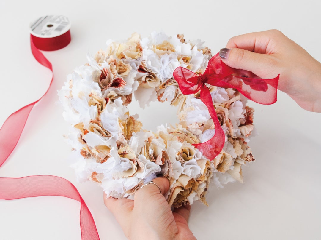 好きな素材や色の布でつくるので、自分だけの個性的なクリスマスリースに仕上げることができます。素材の色味やアイテムの組み合わせを工夫することで、クリスマス以外の時期にも使えるインテリアに。目に映るたびに気分が上がって、毎日を楽しく過ごせるはず。
