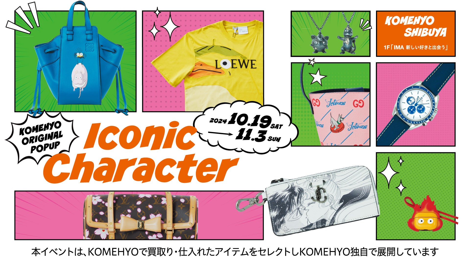今回は、そんな渋谷の街に昨年11月にOPENしたKOMEHYO SHIBUYAにて、ルイ・ヴィトンやロエベ、グッチといったハイブランドと、スタジオジブリやポケットモンスターといった様々な有名アニメーション作品に登場するキャラクターがコラボレーションしたアイテムなどを集めたPOP UPを企画しました。