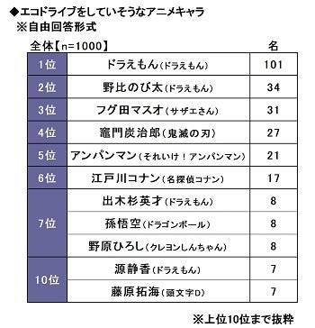 エコドライブをしていそうなアニメキャラを聞いたところ、1位「ドラえもん(ドラえもん)」(101名)、2位「野比のび太(ドラえもん)」(34名)、3位「フグ田マスオ(サザエさん)」(31名)、4位「竈門炭治郎(鬼滅の刃)」(27名)、5位「アンパンマン(それいけ!アンパンマン)」(21名)となりました。