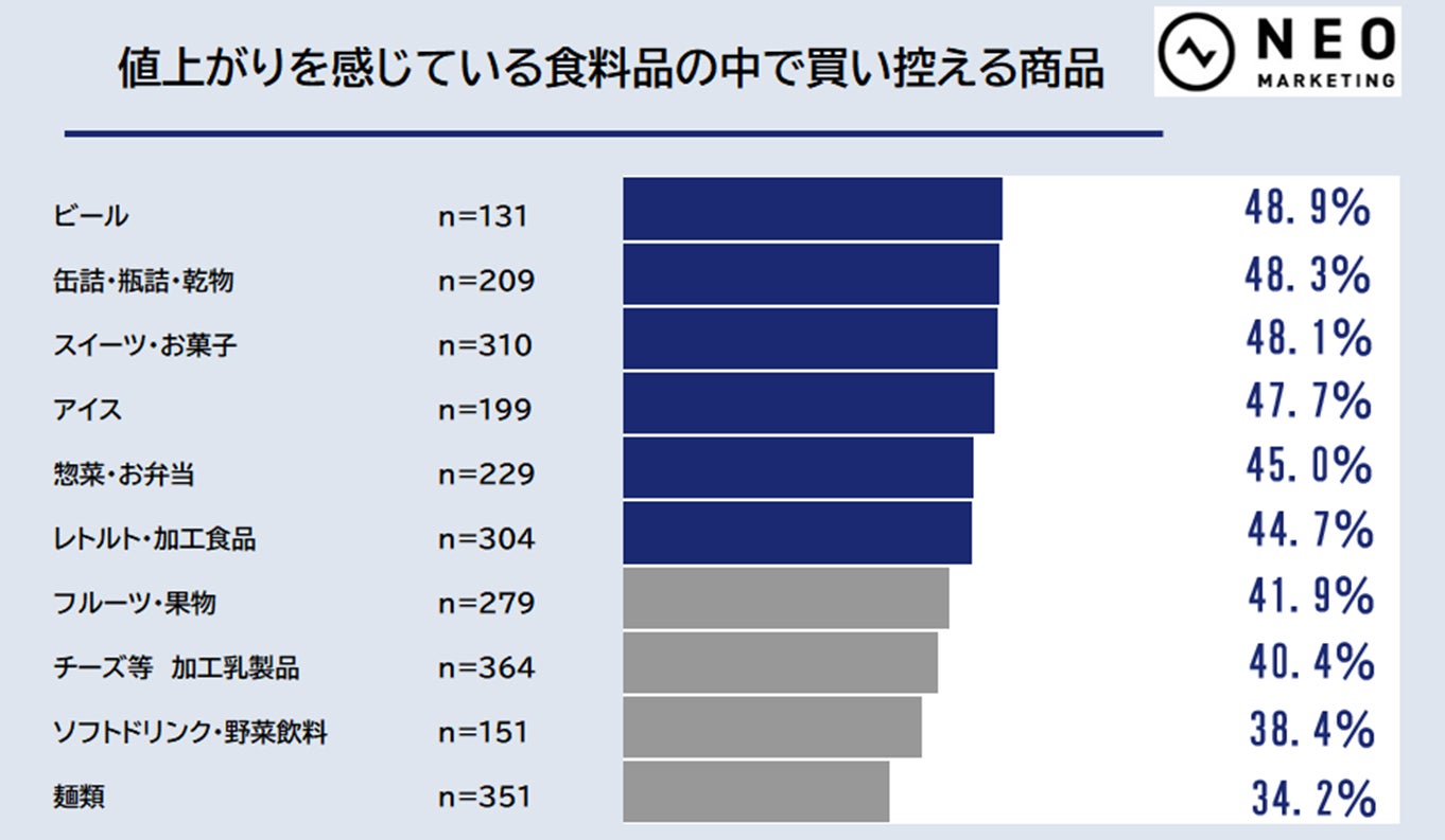 全国の20歳以上の男女1000人に聞いた「食料品の値上げに関する調査」値上げにより買い控える人が最も多い商品はビール!