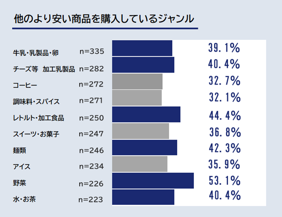 その結果、普段同じブランドの商品を購入している方が最も多かった「牛乳・乳製品・卵」は39.1%、「チーズ等 加工乳製品」「レトルト・加工食品」「水・お茶」、「麺類」、「野菜」等は、40%を超える方が別の商品を購入していることがわかりました。
