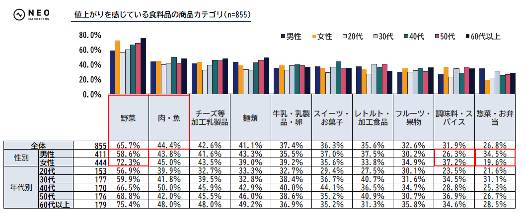 性別、年代別に見ると、「野菜」の値上がりを感じている方は、女性が男性よりも14ポイント高く、年代が上がるにつれてより値上がりを感じている結果となりました。