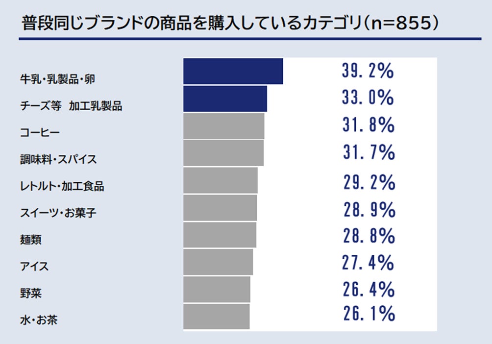「牛乳・乳製品・卵」、「チーズ等 加工乳製品」がTop2となりました。これらのジャンルは、普段同じブランドの商品を購入する方が多い結果となりました。