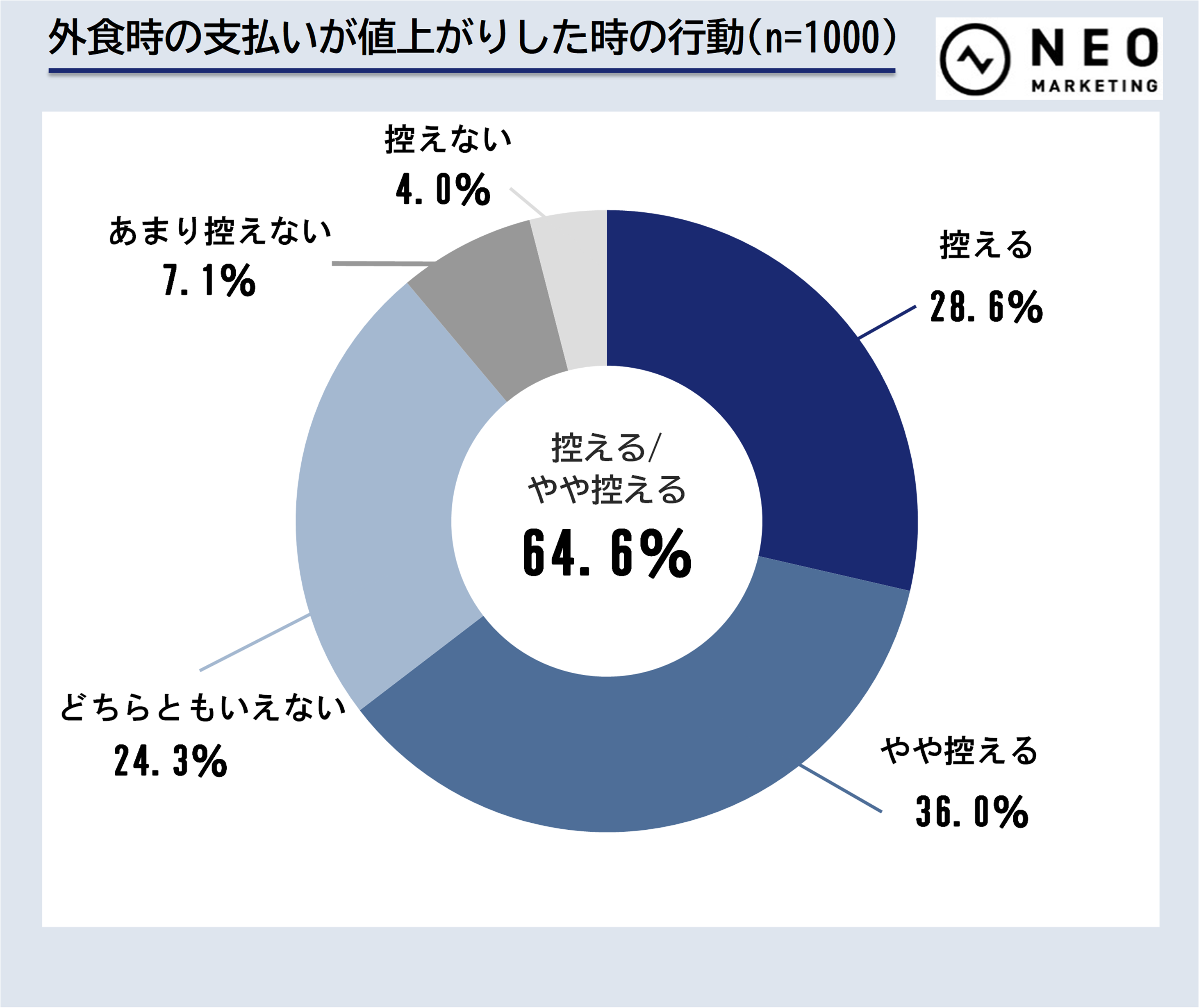 外食時の支払いが値上がりした時の行動についてお聞きしました。「控える」「やや控える」と回答した方は64.6%とやや高い結果となりました。一方で、「控えない」「あまり控えない」と回答した方は11.1%と、外食の支払いが値上がりした際の行動について意識をする方が多いようです。