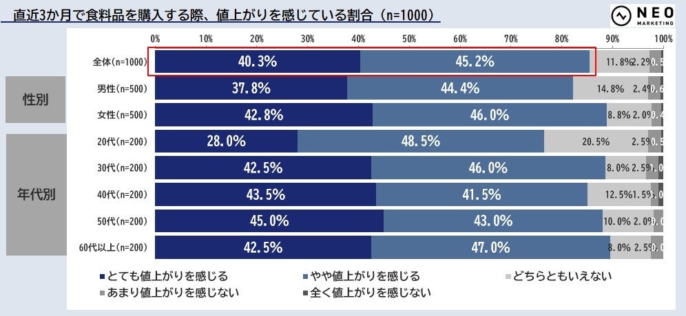 直近3か月で食料品を購入する際、値上がりを感じているかについてお聞きしました。全体を見ると、「とても値上がりを感じる」「やや値上がりを感じる」と回答した方は85.5%と非常に高い結果となりました。
