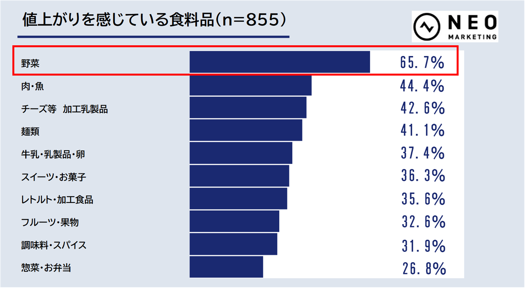 値上がりを感じるのは「野菜」が最も高く、2位の「肉・魚」に21.3ポイントも差をつけています。野菜は収穫状況によって常に価格が変動しやすいため、値上がりを意識している方が多いことも要因の一つと考えられます。