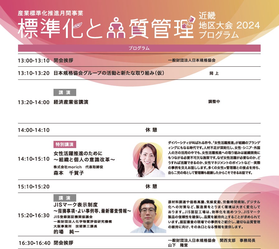 女性活躍推進への取り組み、JISマーク表示制度等、皆さまの実務にお役立ていただける全3講演が決定しました。