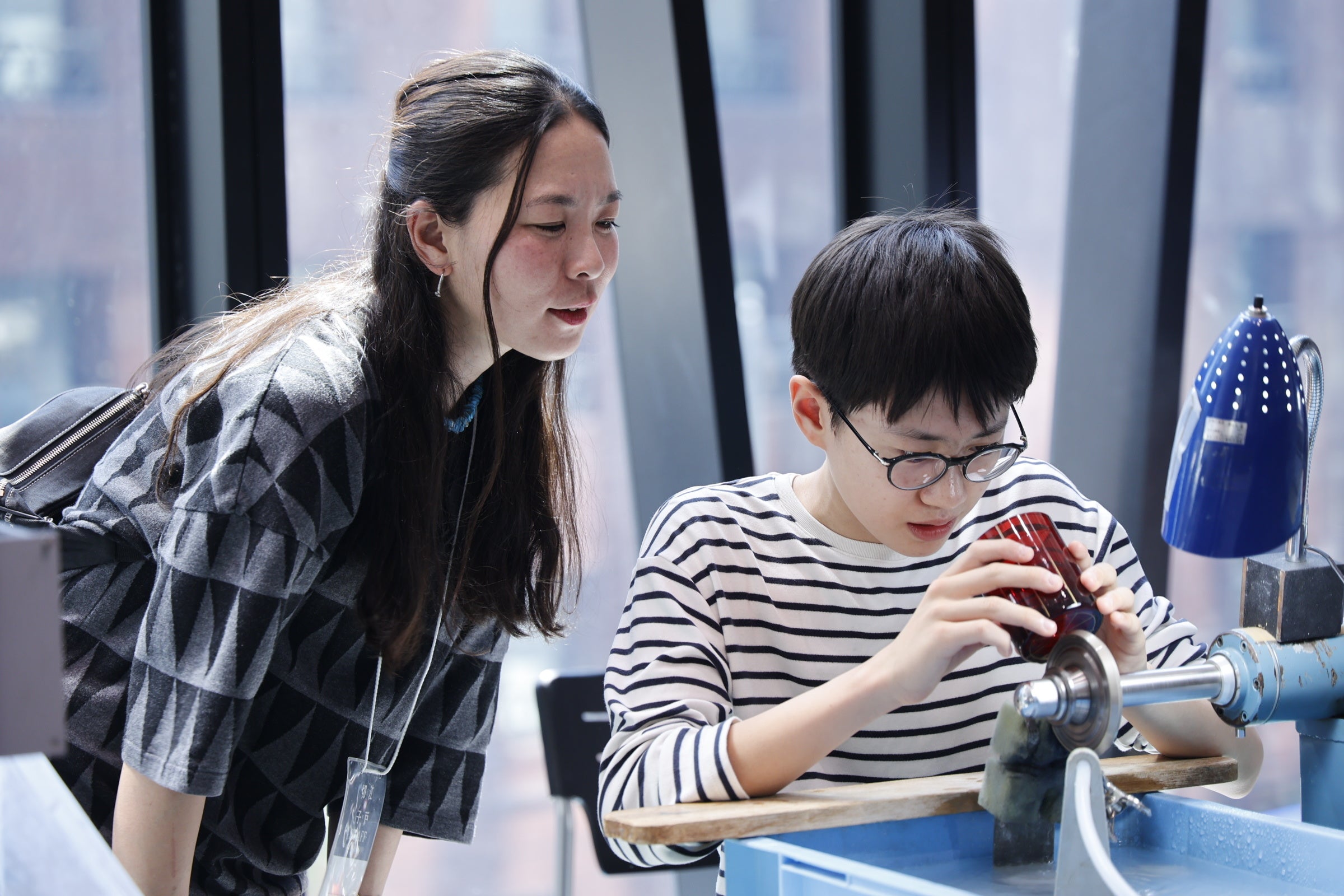 毎年、事前予約だけでほぼ満席となる大人気体験プログラム。伝統工芸士をはじめ、現役で活躍する職人たちがマンツーマンに近い形で直接指導します。職人と同じ機械を使い、ガラスを削る手応えを体感。約15分で作品を完成させ、そのまま持ち帰りいただけます。小学生から参加可能。
