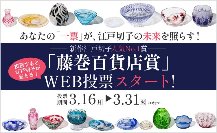 若手から重鎮まで、職人が魂を込めて切り出した渾身の一作が集う「江戸切子新作展」。本展では今年も、専門家による厳正な審査に加え、一般の皆様が審査員として参加できるWEB投票を実施いたします。もっとも多くの支持を集め、人気No.1に輝いた作品には、栄誉ある「藤巻百貨店賞」の称号が贈られます。
