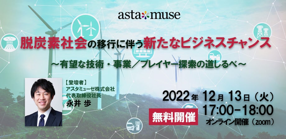 アスタミューゼ株式会社(本社:東京都千代田区、代表取締役社長 永井歩)は、2022年12月13日(火)17:00~18:00に、無料ウェビナー「脱炭素社会の移行に伴う新たなビジネスチャンス ~有望な技術・事業 / プレイヤー探索の道しるべ~」を開催いたします。2022年7月に実施した同タイトルのウェビナーが大変好評だったため、内容を一部アップデートした上での再度の開催となります。