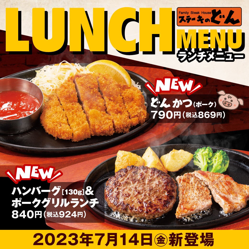 株式会社アークミール(本社:埼玉県さいたま市、代表取締役社長:柳 先)が運営する「ステーキのどん」は、2023年7月14日(金)から全国60店舗で、リーズナブルな価格帯でボリュームも安心な「バリューランチ」カテゴリをランチメニューに新たに導入します。新メニューとしてご提供するのは、ステーキ店のこだわりが詰まった「どんかつ(ポーク)」と「ハンバーグ(130g)&ポークグリルランチ」の2品です。