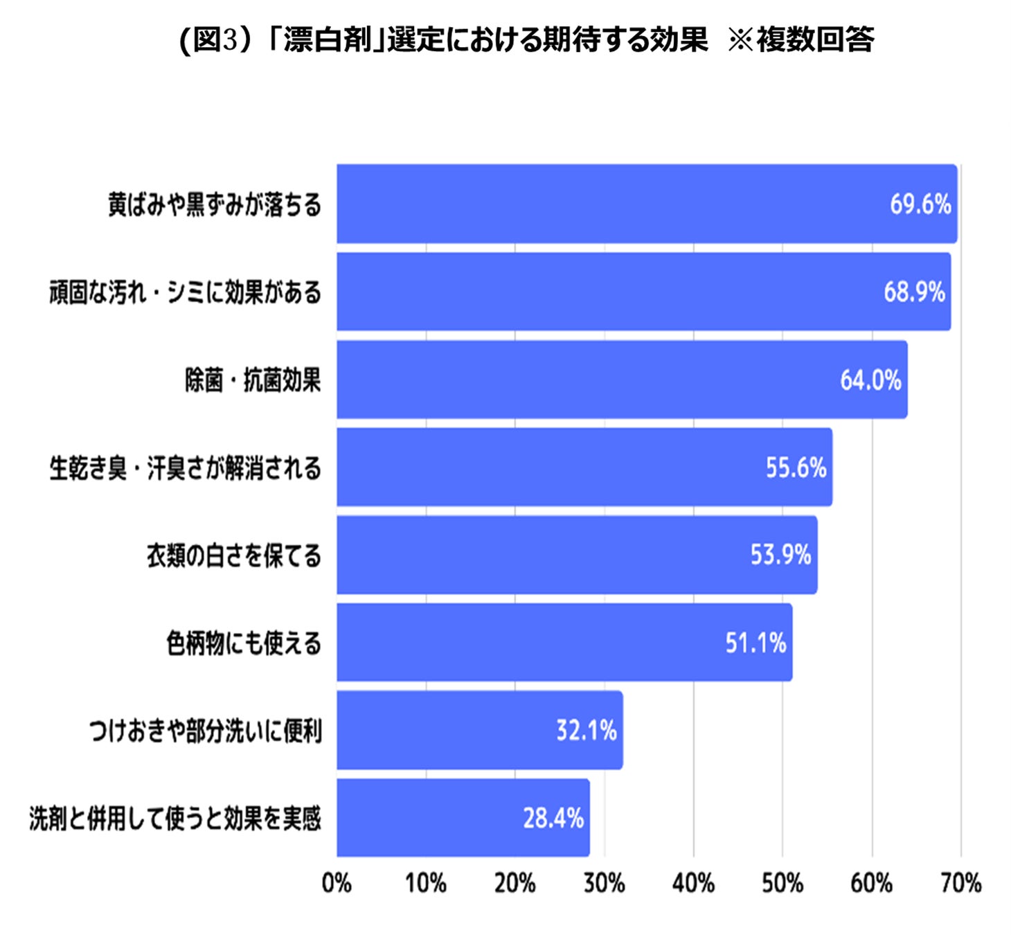 初夏のジメジメした季節は、汗や湿気によるニオイ残りや汗染み・黄ばみといった洗濯ストレスが増えるタイミングです。「洗剤選びで重要視するポイント」として、「汚れ落ち(87.0%)」や「ニオイ除去(79.9%)」が上位に並びました(図2)。一方で、漂白剤を「生乾き臭・汗臭さの解消」のために使用している人は55.6%にのぼり(図3)、さらに「頑固汚れ(68.9%)」「黄ばみ(69.6%)」といった汚れ対策としても高い支持を得ています。これらの結果から、洗剤と漂白剤の組み合わせ技が汚れ・ニオイ対策において実用的かつ重要な役割を果たしていることがうかがえます。