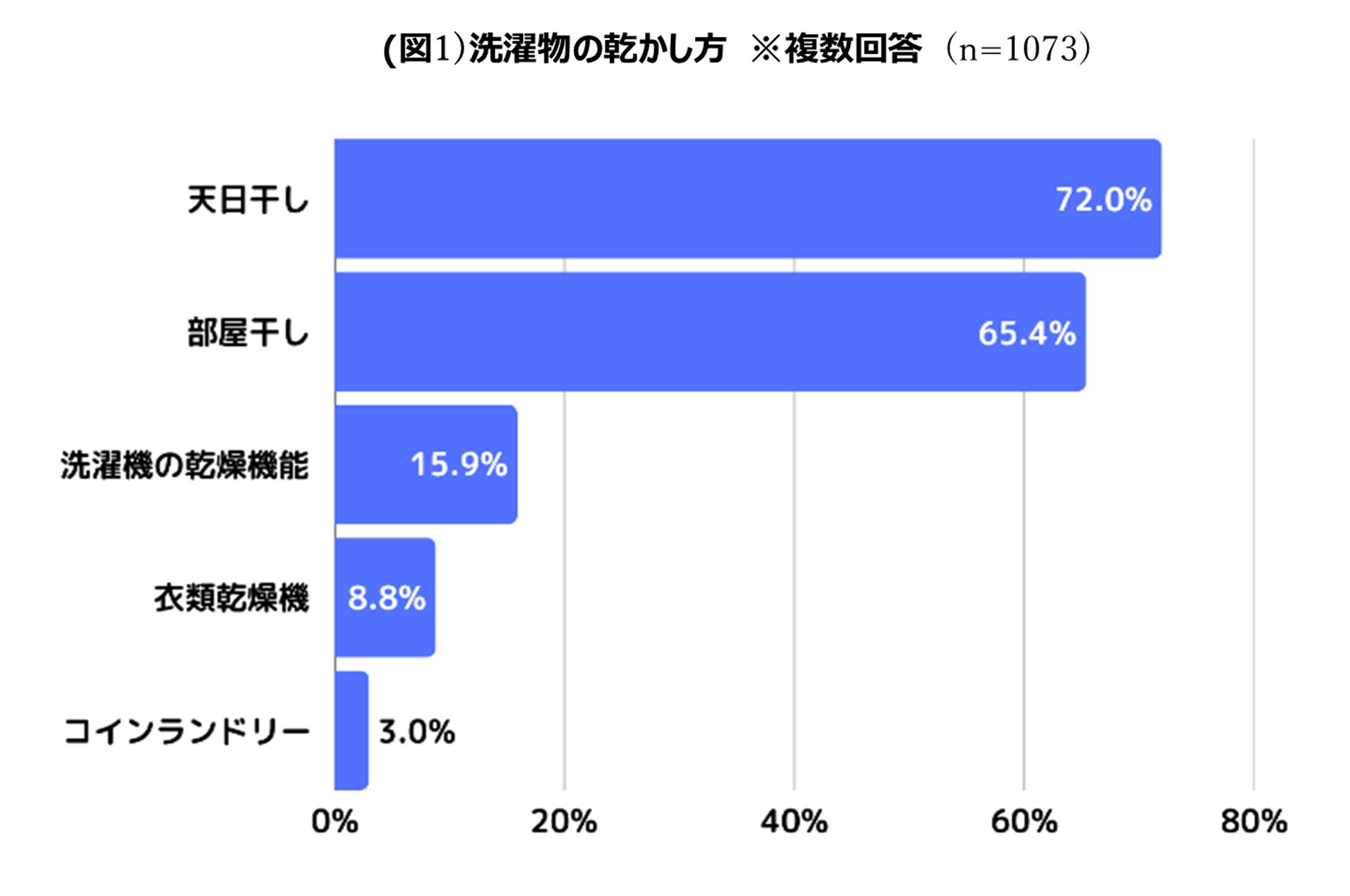 調査の結果、働く女性の約7割が「天日干し」を、さらに約6割強が「部屋干し」をしており(天日干し:72.0%、部屋干し:65.4%)、乾燥機能利用者は15%程度にとどまります。天候や生活習慣に左右される中、自然乾燥と部屋干しを併用するスタイルが定着している様子が伺えます。
