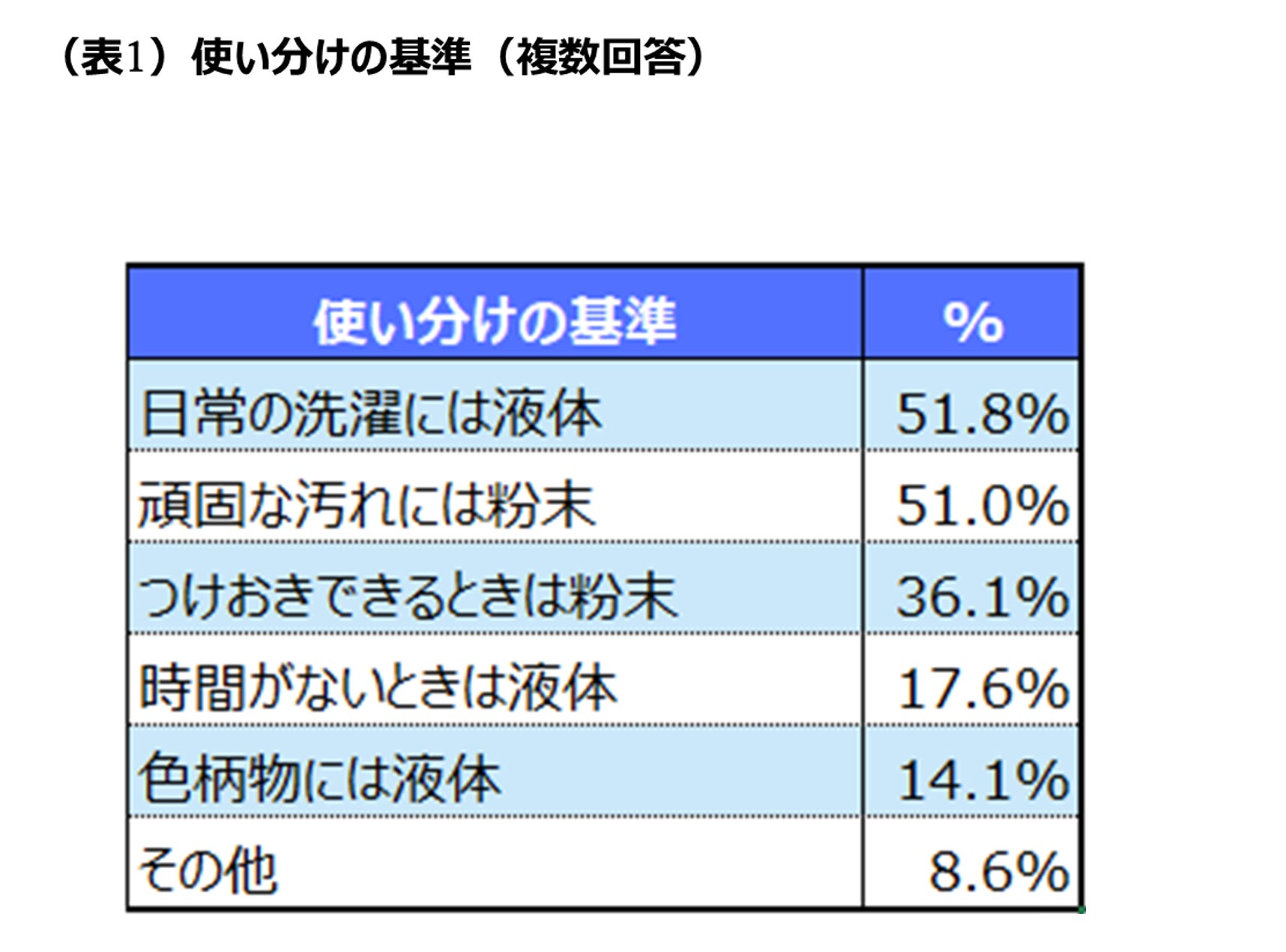 液体タイプと粉末タイプの漂白剤を「使い分けている」か、との問いに、“使い分けている”と回答した人は23.8%(「はい」8.9%+「なんとなく使い分けている」14.9%)(図4)。この層の中では、「液体タイプは日常の洗濯に」「粉末タイプは頑固汚れや週末のつけおきに」と、用途別に賢く使い分ける“スイッチ漂白”が、すでに一定層のユーザーに定着しており、それぞれ51.8%と51.0%と過半数が実践しています(表1)。
