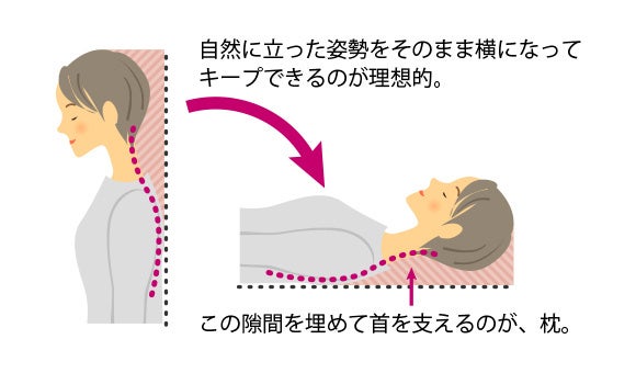 立っているとき、背骨の首部分の頸椎はゆるやかなS字型を描いています。眠りの質を高めるには、横になったときもこのS字型をキープすることが大事です。S字カーブの隙間を埋めることのできるまくらが理想的な高さのまくらです。