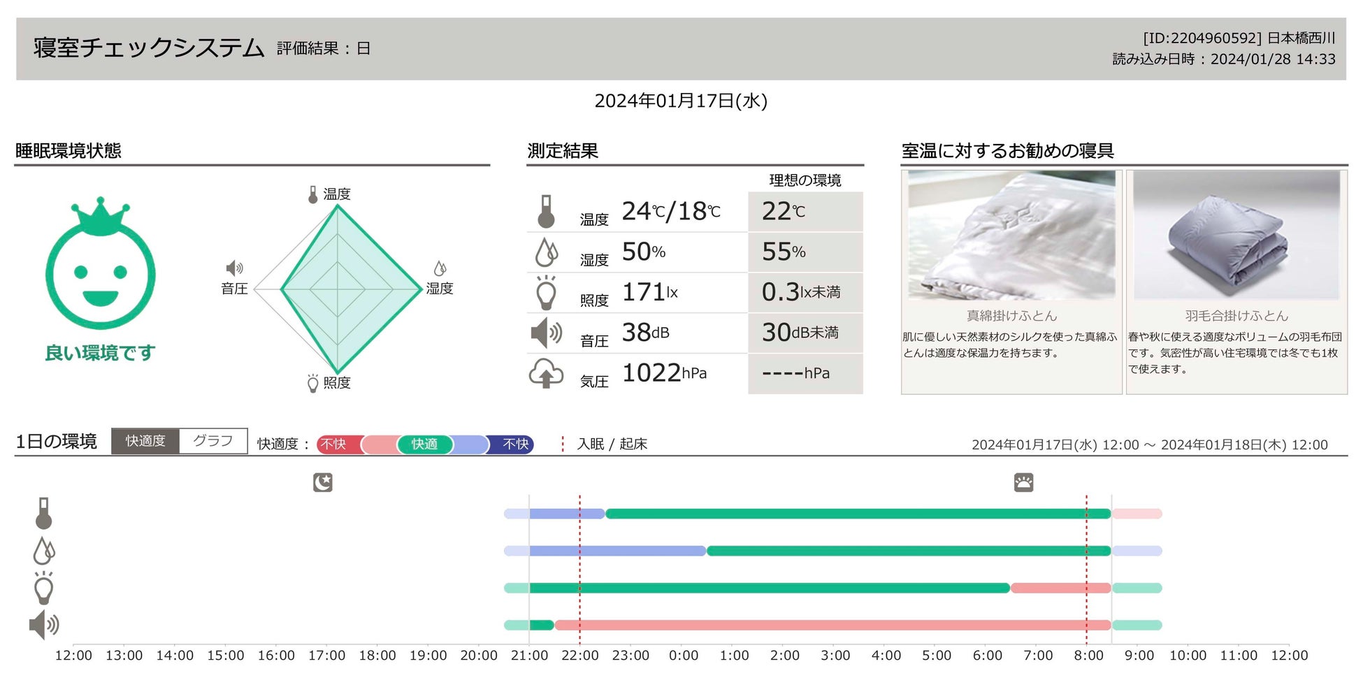 ・ 寝室の温度・湿度・照度・音圧・気圧の測定数値と、その季節の理想的な数値とが一目で比較できます。