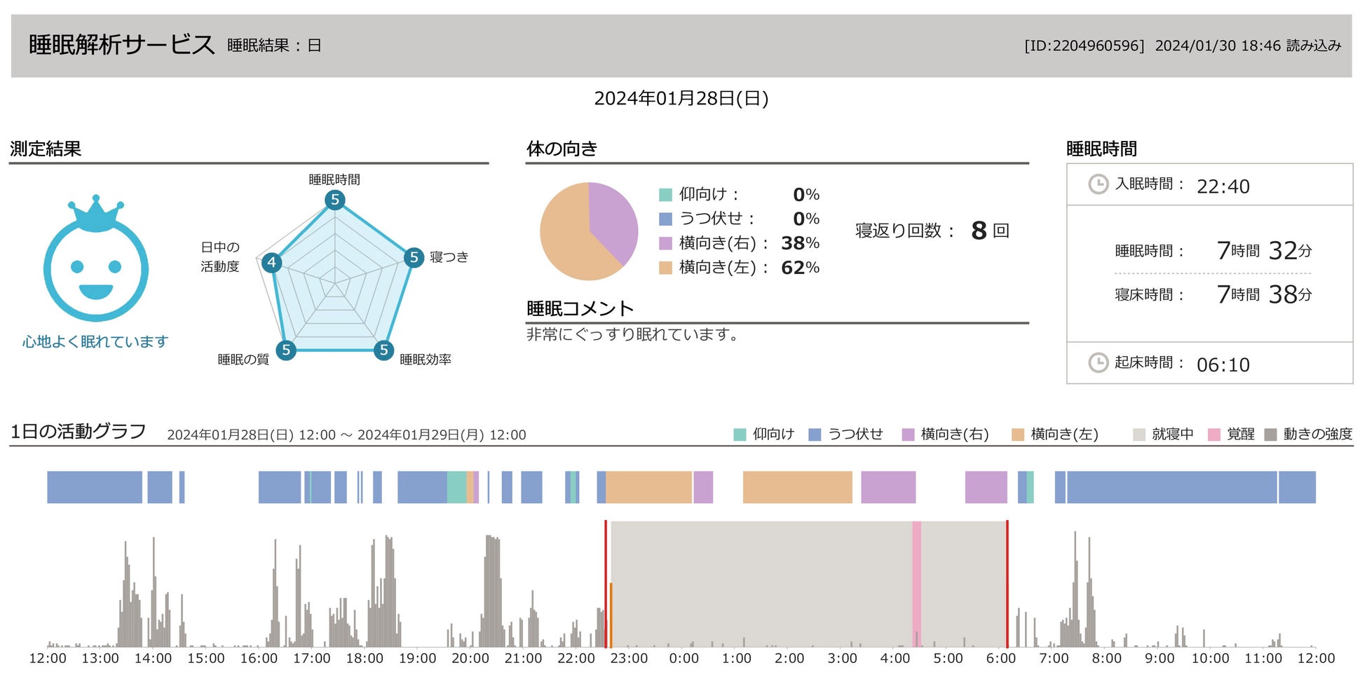 ・ 1日の活動をグラフで表示し、日中の活動量から睡眠中の体の向き、途中覚醒までがわかります。